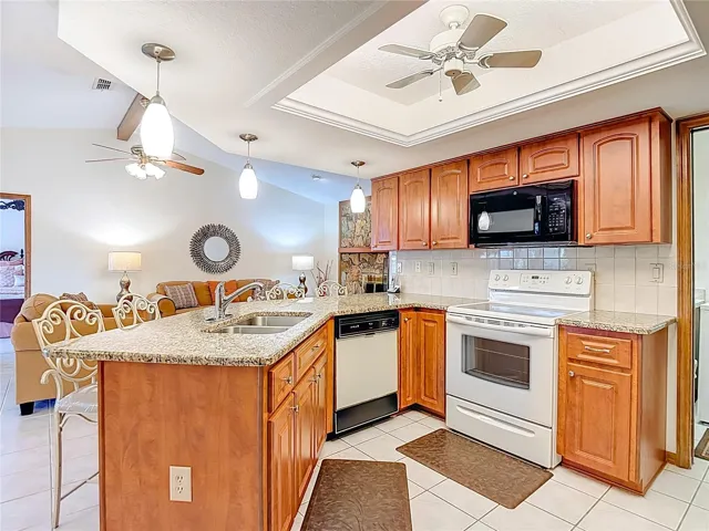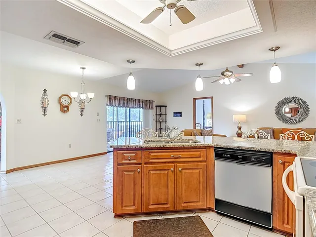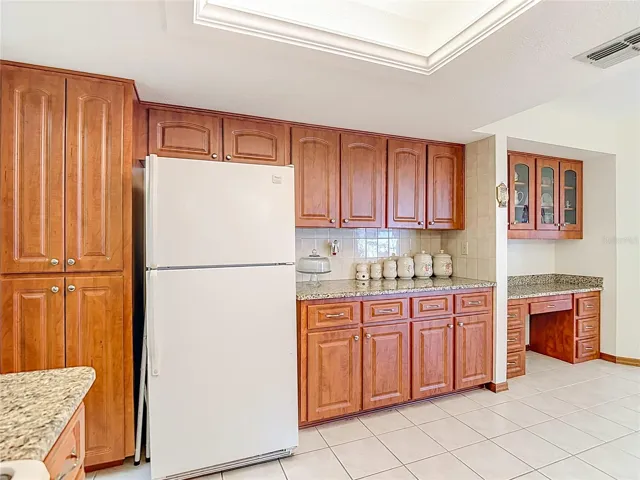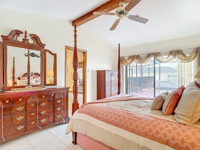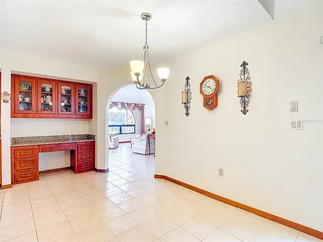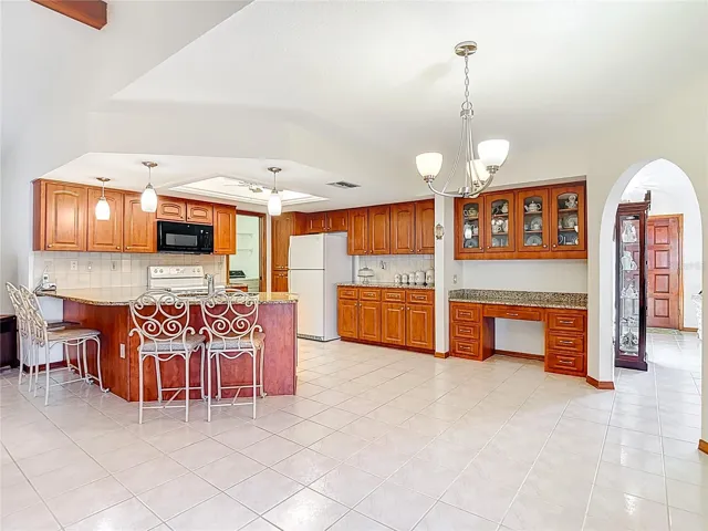 Welcome to this meticulously maintained 3-bedroom, 2-bathroom pool home nestled on a generous 0.32-acre lot. The property offers both privacy and curb appeal with partial fencing and a lovely landscaped front yard. An extended driveway leads you to a cozy front porch—the perfect spot to enjoy your morning coffee. Step inside and be greeted by an open floor plan that seamlessly connects the living and dining areas. Gorgeous tile flooring and a vaulted ceiling adorned with wood beams create a warm, inviting atmosphere. The spacious living room/dining room combo is ideal for entertaining family and friends. The expansive eat-in kitchen is a chef’s delight, featuring updated cabinets, granite countertops, a stylish tile backsplash, a built-in desk, closet pantry, and sliding doors that open directly to the pool area. The kitchen flows into the family room, where wood beam ceilings and a wood-burning fireplace offer comfort and charm for cooler evenings. Retreat to the spacious master suite, complete with a walk-in closet and elegant wood beam ceiling. The master bath boasts a separate vanity area, a tub with tile shower surround, and a large linen closet for added convenience. The two additional bedrooms are generously sized, each featuring walk-in closets and sharing a well-appointed second bathroom. The dedicated laundry room offers a utility sink, additional closet pantry, and comes equipped with a washer and dryer. Enjoy Florida living at its finest on the spacious lanai, which showcases decorative stamped flooring. The lanai opens to a sparkling diamond brite pool and spa, complete with a beautiful waterfall feature and views of the expansive backyard with vinyl fencing—perfect for relaxation and entertaining. Additional features include oversized 2 car garage with pull-down attic access, Roof 2012, AC 2014, brand new water heater, newer aluminum ceiling in lanai and a 7-zone sprinkler system. This meticulously maintained, move-in-ready home offers a perfect blend of comfort, style, and modern upgrades—making it an exceptional find for those seeking a spacious retreat. Repaired Sinkhole Home. Docs available upon request.