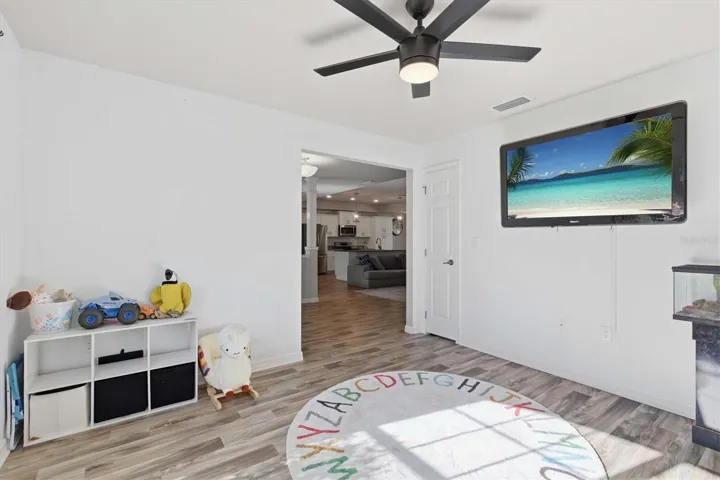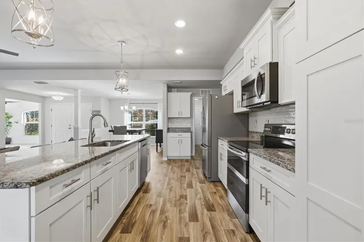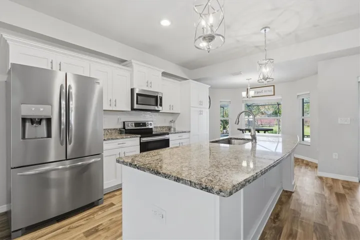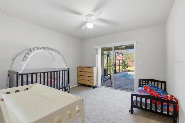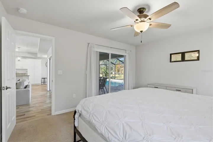 A POOL HOME THAT FITS YOUR LIFESTYLE ON ~½ ACRE | NO HOA | 2019 BUILT | 3-WAY SPLIT BEDROOM PLAN. Welcome home to this beautifully built Palmwood Builders residence featuring 4 bedrooms, 2 baths, and a 2-car garage—perfectly set in a neighborhood feel with a touch of rural peace and quiet. With no HOA and no restrictions, you’ll enjoy the freedom to live the way you want, plus plenty of room to spread out on approximately half an acre. Step inside through the double-door entry into a bright, open floor plan designed for everyday living and easy entertaining. The spacious living room showcases a tray ceiling and durable vinyl flooring throughout the main living areas. The kitchen is a true centerpiece with white shaker cabinets with crown molding, a built-in pantry, granite countertops, stainless steel appliances, and an inviting island/breakfast bar accented by pendant lighting—plus a coffee bar that makes mornings feel like a treat. Enjoy meals in the sunny breakfast nook with bay windows overlooking the pool, and host holidays in the separate formal dining room. The private primary suite is your retreat, featuring sliders to the pool, two walk-in closets, and a spacious en-suite bath with dual sinks and a walk-in shower with marble-look tile. Bedrooms 2 and 3 are tucked on the opposite side of the home with a guest bath between them, offering privacy for family and guests—plus Bedroom 3 has sliders to the pool. (The 4th bedroom offers a closet and just needs a door to complete the space.) Outside is where this home truly shines: a beautiful screened-in pool with pavers, a covered lanai, and a relaxing pool seat—made for weekends at home. The huge backyard leaves room for playsets, pets, gardens, and more, and the additional paver patio is perfect for grilling and gathering with friends and family. A newer build, a big lot, and a pool-ready lifestyle—this one checks all the boxes.