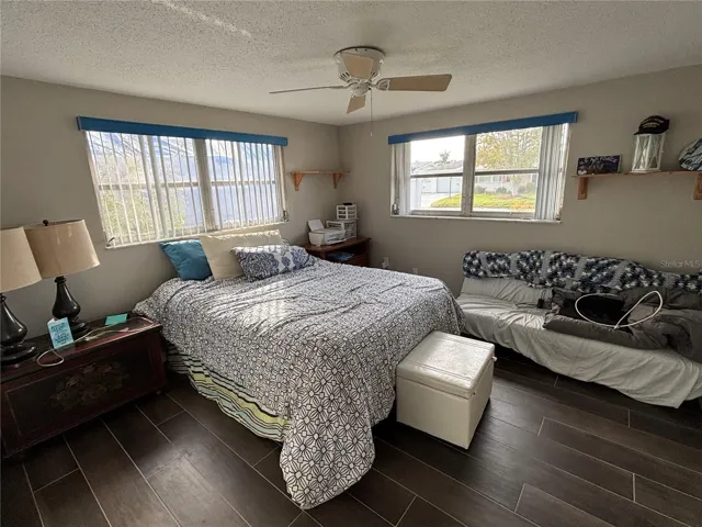 As you enter, you’ll immediately appreciate the clean white tile flooring throughout the main living areas, while both bedrooms feature vinyl plank flooring—no carpet anywhere in this super clean home. The floor plan offers a large living room plus an impressive 30-foot-long family room with a wood-burning fireplace, perfect for relaxing or entertaining.