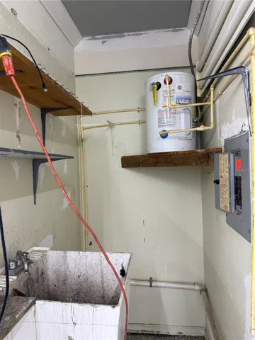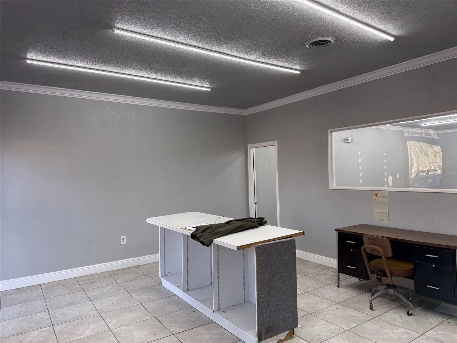 Beyond the reception area, a sturdy metal door leads into a spacious back section that can be customized for a variety of uses. Whether you envision additional offices, a showroom area, or a retail workspace, the flexible layout allows you to tailor the space to your needs. There’s a convenient half-bath at the back and an 8-foot-5-inch-wide roll-up door providing easy access to the rear parking lot.