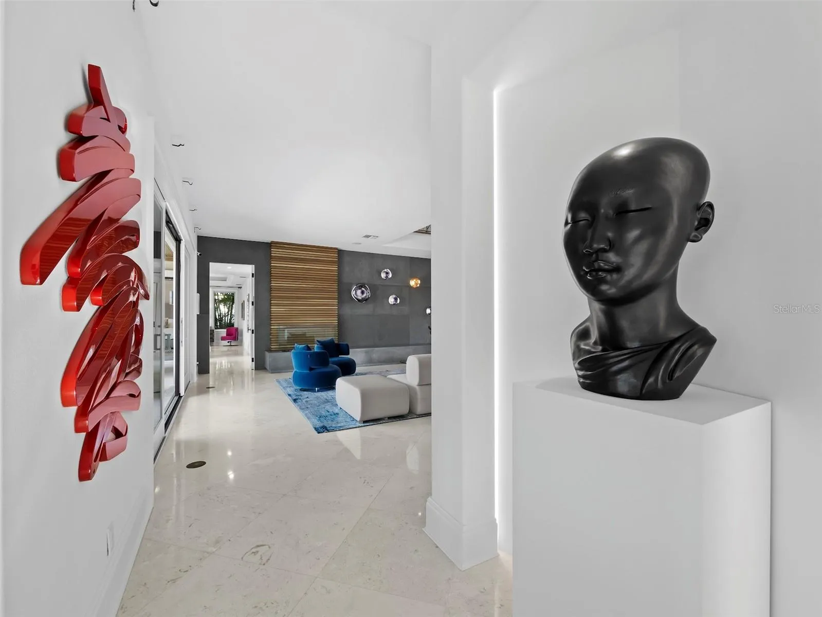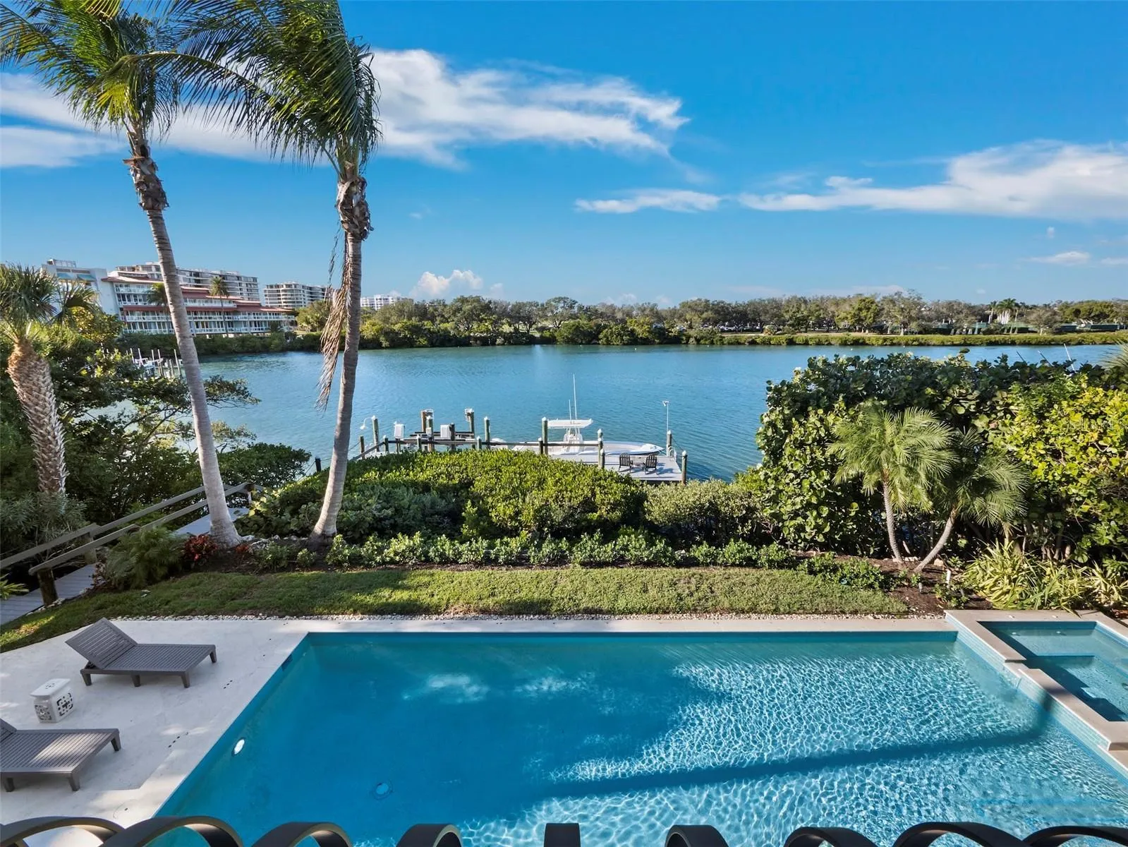 Outside, meticulously lit landscaping, a travertine-framed saltwater pool and spa, and a private dock with 14,000 lb lift, new motors, and enhanced WiFi create a turnkey boating haven with immediate access to Sarasota Bay and the Gulf. Practical amenities include whole-house Kohler generator, hurricane protection, impact glass, large utility room with dual Sub-Zero wine refrigerators, and an oversized three-car garage with EV charger wiring.