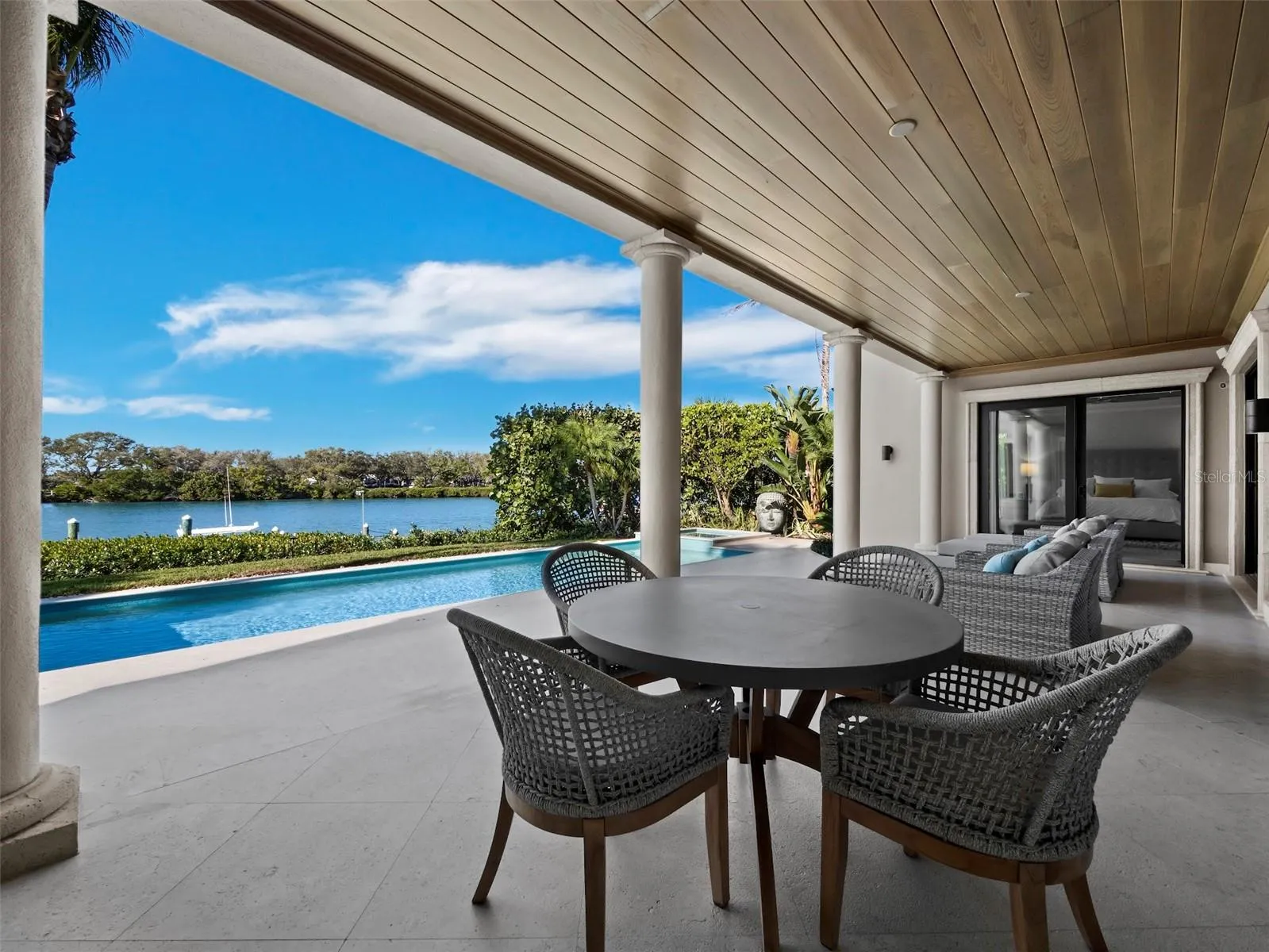 The fully reimagined Cucina Ricci kitchen serves as a chef’s workspace and social hub, with minimalist custom cabinetry, a generous island with seating, and an ultra-premium Miele VitroLine suite including double ovens, induction cooktop, and integrated coffee station. Just beyond, a waterfront lounge or media den opens directly to the covered loggia, creating a seamless indoor-outdoor living experience enhanced by an integrated Yamaha sound system for both interior and exterior zones.