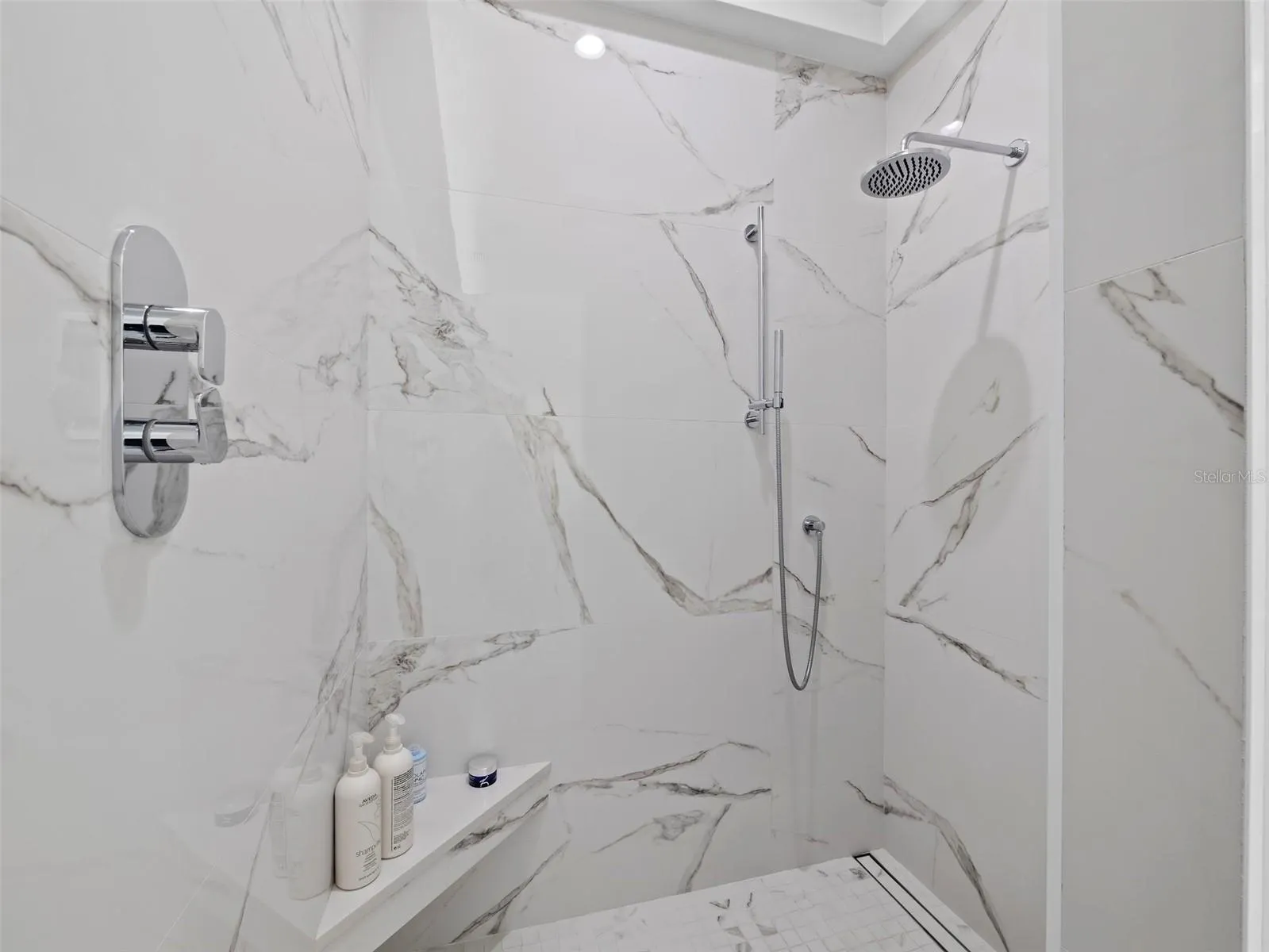 Perfectly positioned for privacy, the main-level owner’s retreat is a secluded sanctuary with its own hallway entrance, multiple terrace access points, tray ceiling, recessed lighting, and windows on three sides framing tranquil water views. The suite is completed by dual renovated walk-in closets and a spa-inspired bath with oversized vanities, private water closet, and expansive walk-in shower with rain head, while upstairs three en suite guest suites and a mezzanine den provide luxurious accommodations and flexible space.