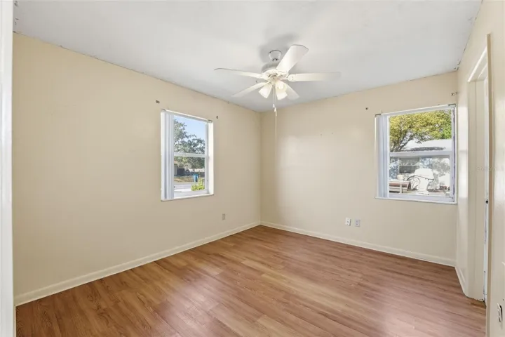 One or more photo(s) has been virtually staged. Take a look at this inviting 3-bedroom, 2-bathroom home featuring two additional bonus rooms and beautiful laminate flooring throughout much of the space. As you approach the home, you’re greeted by a charming brick entry and a decorative white iron fence that surrounds the covered front porch—an ideal spot to relax, sip your morning coffee, and enjoy Florida’s beautiful weather and natural surroundings. Step inside to a spacious living room filled with natural light. At the back of the room, two large glass doors open to the pool area, creating a stunning view and a seamless indoor-outdoor connection. To the right, the living space flows effortlessly into the dining area and kitchen. Both feature crisp white tile flooring, while the kitchen offers white cabinetry, a mix of stainless steel and black appliances, and a convenient pantry closet. A large window above the kitchen sink overlooks the backyard, flooding the space with sunlight and offering the perfect spot for houseplants. Just off the kitchen, you’ll find the first bonus/flex room—a generously sized space with wood floors and private access. This area is ideal for a mother-in-law suite, guest quarters, or a private home office. The primary bedroom offers easy access to its own bathroom just outside the door. Two additional bedrooms, both with wood floors, share a Jack-and-Jill bathroom featuring charming retro tile that adds character and style. A second flex room provides even more versatility and could easily serve as a third bedroom, playroom, or office. Out back, the partially covered and fully screened porch overlooks a gorgeous blue swimming pool—perfect for relaxing or entertaining year-round. A large storage shed offers plenty of space for tools and outdoor equipment. Beyond the screened porch, an additional patio creates even more room for outdoor seating or a barbecue area. This patio wraps around the right side of the home and extends toward the potential in-law suite, enhancing the home’s flexibility. Mature trees in the backyard provide shade and a peaceful, private setting. Located in Spring Hill, this home places you close to Weeki Wachee Springs, known for its crystal-clear waters and kayaking, nearby Gulf Coast beaches ideal for sunsets and fishing, scenic parks and nature preserves for walking and wildlife viewing, and convenient access to shopping, dining, and everyday amenities. This is Florida living at its best—relaxed, comfortable, and well-connected.