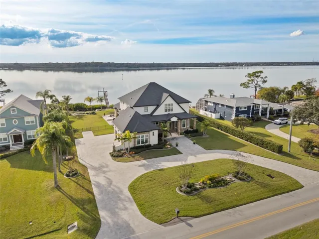 The exceptional width of the lot and bay frontage creates a dramatic sense of openness, with ample room for waterfront lounging and future dock considerations. Mature surroundings and spacing between neighboring properties further reinforce the home’s private, estate-like feel.