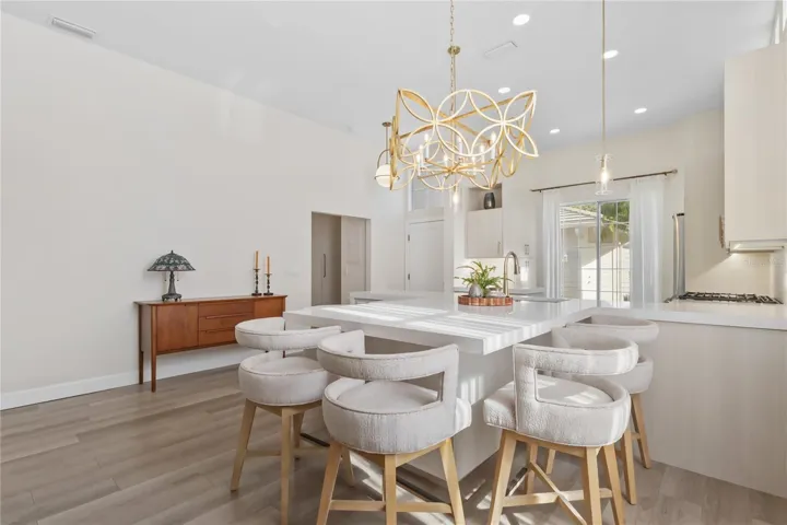 The chef’s kitchen is a true showpiece, thoughtfully redesigned with locally crafted custom wood cabinetry, Kitchen Craft pull-outs, soft-close doors and drawers, under- and over-cabinet accent lighting, a coffee nook, convenient drop-off counter, farmhouse sink, and thick quartz countertops. High-end stainless steel appliances and a built-in quartz table create the perfect space for casual breakfasts or effortless dinners—delivering a true culinary experience.