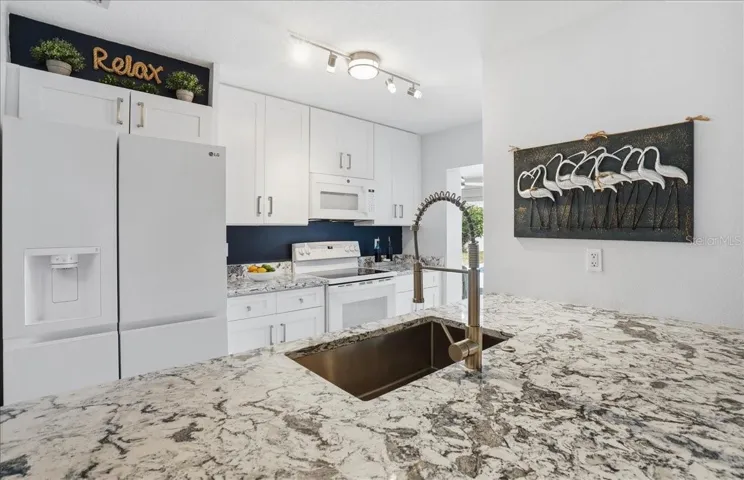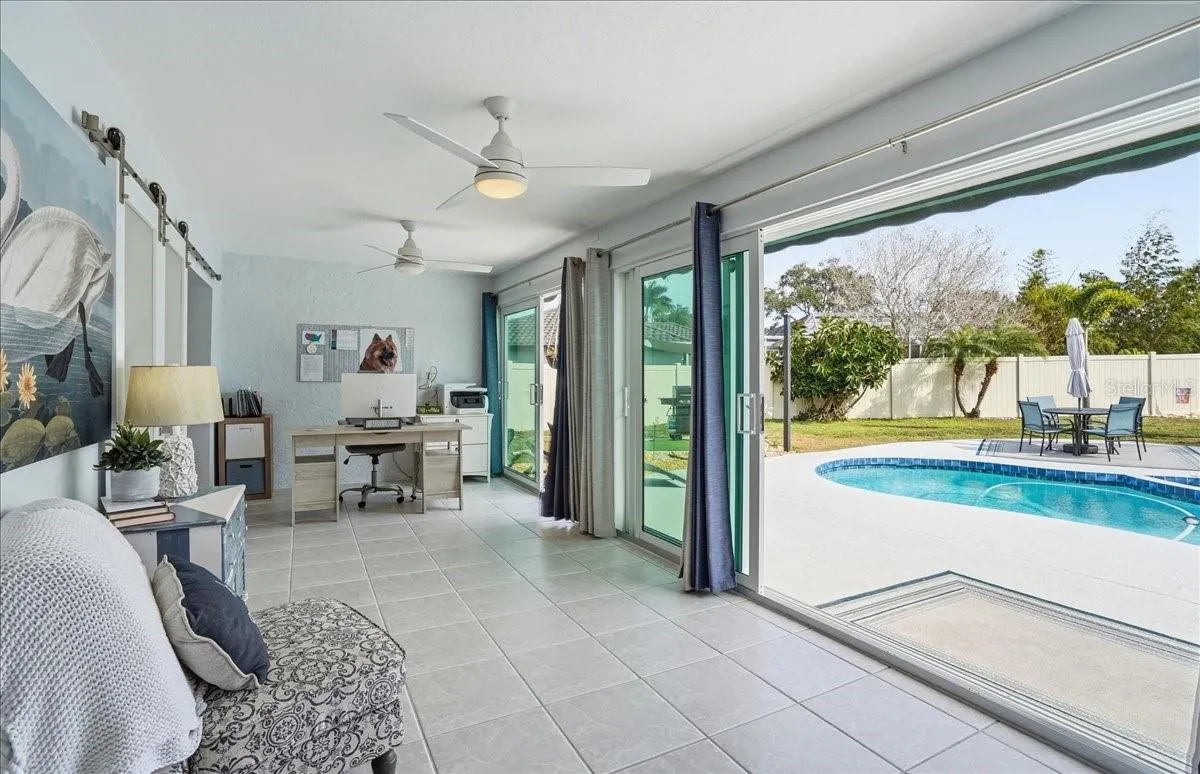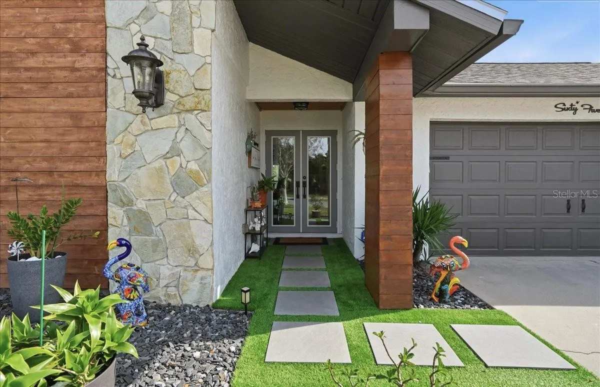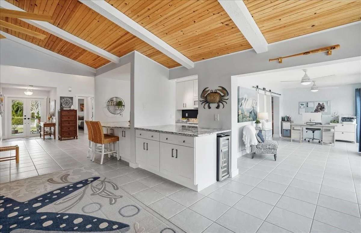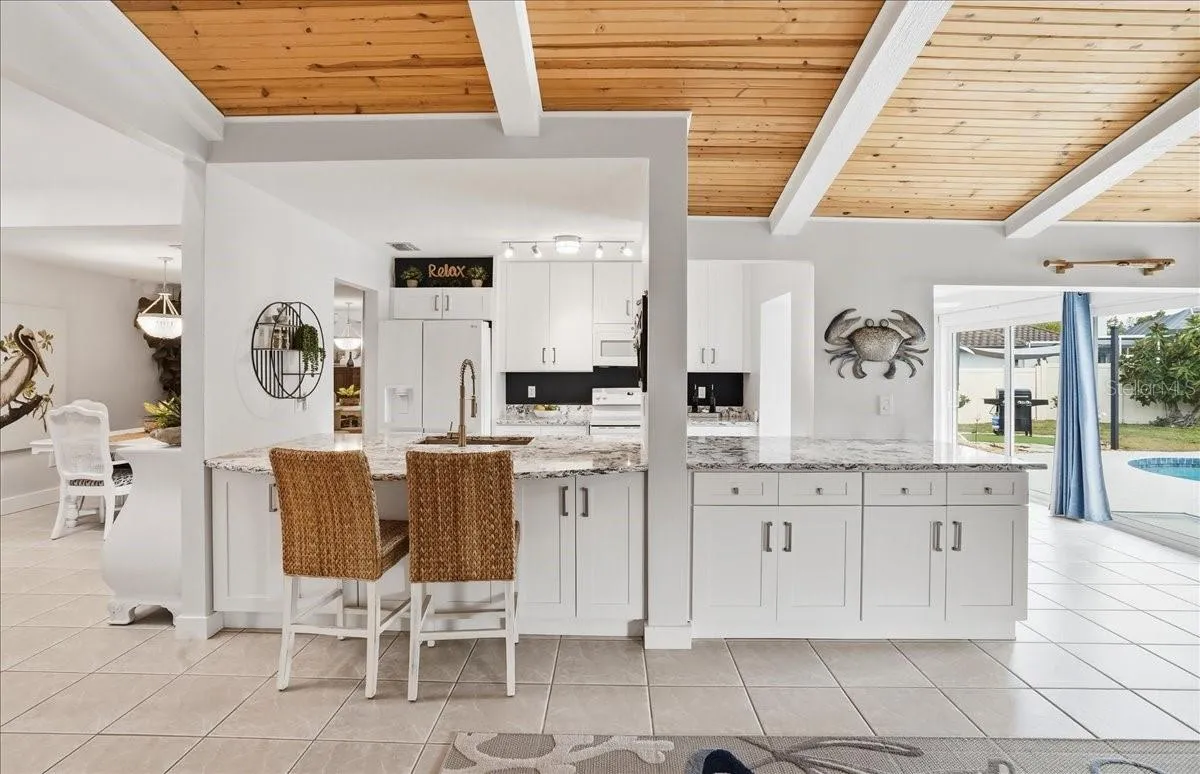 A unique home offering a scrumptious combination of mountain chalet meets beach cottage. Allow me to introduce you to the ‘SEA JAY CHALET’. Upon approach, you begin to understand the expanse of this almost 14,000 square foot lot as you come ‘round the bend’. Beautifully landscaped and finished with stained cedar and stone accents- you can already tell this isn’t your typical Florida home. Glass double-doors lead you into the spacious, sky-light enhanced foyer entry and then…….WOW! A substantially sized great room with vaulted ceilings enhanced with pine tongue-and-groove accented with white wood beams and a decorative wood fireplace wall and mantle. The oversized living space is open to the updated kitchen and also the light and bright, sliding glass door edged Florida Room full of natural light, peace and privacy surrounded with palms and 6’ of privacy lined fencing. The updated kitchen offers seating and serving bars with extra cabinetry, Cambria quartz tops, newer appliances and the entire home is graced with a lovely selection of consistent ceramic flooring. Both baths are delectably refreshed and carry the Sea Jay theme of birds on thru the home. An outside pool/spa deck with retractable awning, grilling pad, cool shed, and rock-scapes help to complete the ambiance of this fascinating homestead. Gulf Gate East is an established community of mature trees, wide roads, sidewalks on both sides and in what one may call the ‘SWEET SPOT’ of Sarasota. Near some of the best beaches, shopping, and dining districts around the town. Sea Jay’s Chalet is truly unmatched in this marketplace and a home in a class all its’ own.