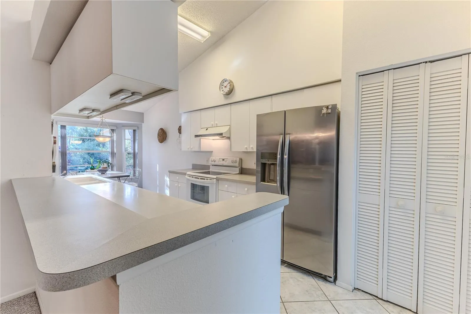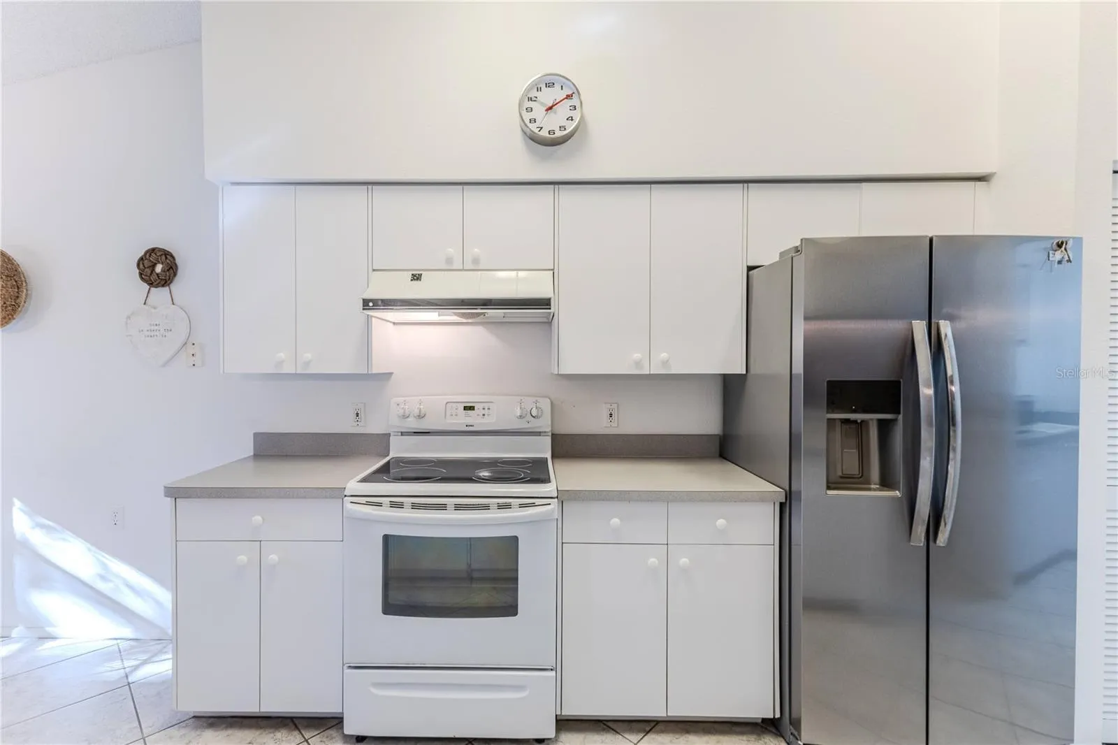 The kitchen offers large tile flooring, a new refrigerator, a wall pantry, and an inviting eating space that overlooks peaceful green space—ideal for enjoying your morning coffee.