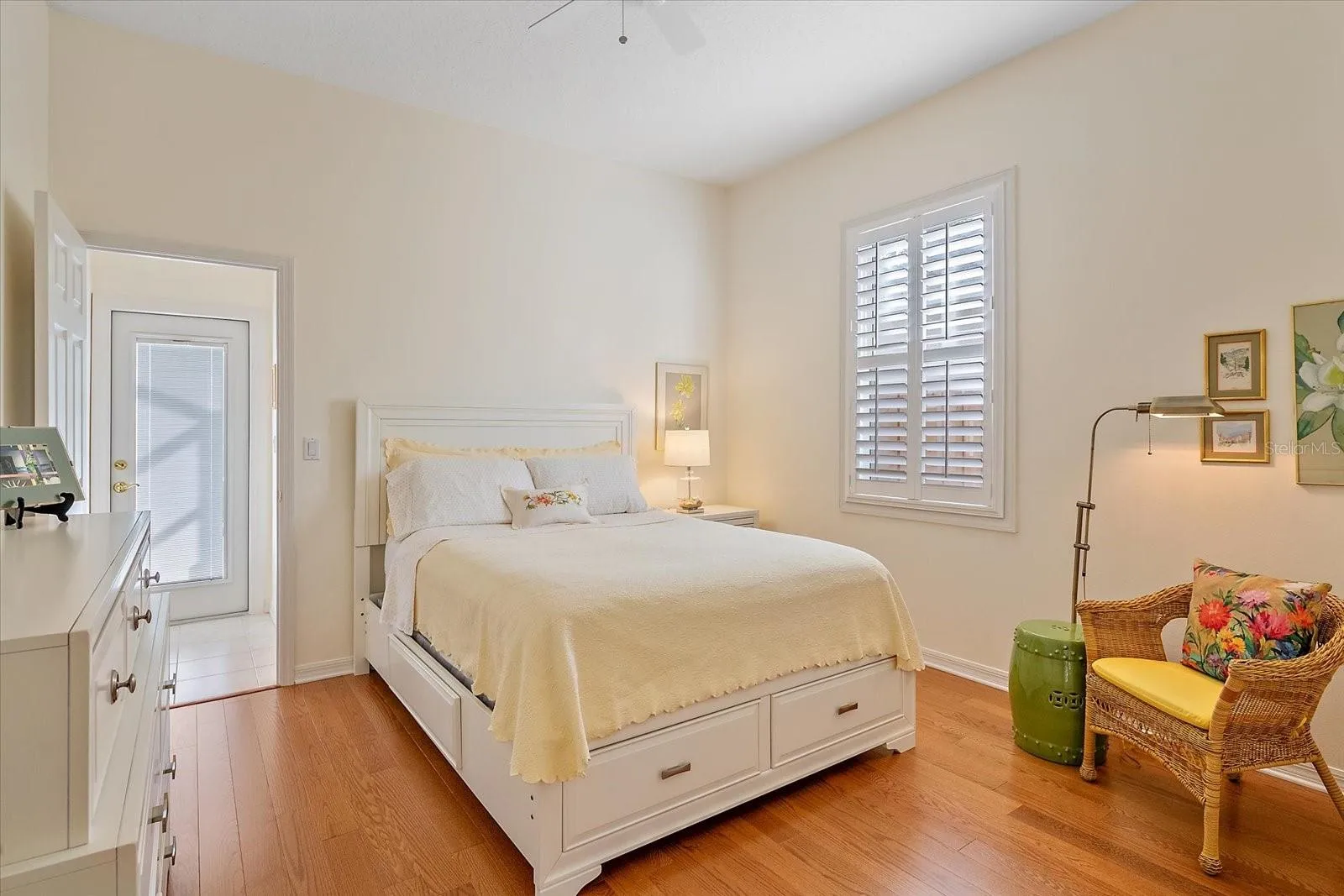 Welcome to a beautifully updated home offering comfort, efficiency, and a prime Sarasota location. As you enter, you’re greeted by an open and inviting living room where sliding glass doors lead directly to the lanai, revealing a sparkling pool and spa with beautiful golf course views, perfect for relaxing or entertaining. Ceramic tile runs throughout the home, while engineered hardwood flooring installed in 2023 adds warmth to all bedrooms. Bermuda shutters throughout the home add both charm and storm protection, while new window screens were added in 2025. The home was painted in 2022, enhancing its clean, move-in-ready feel.