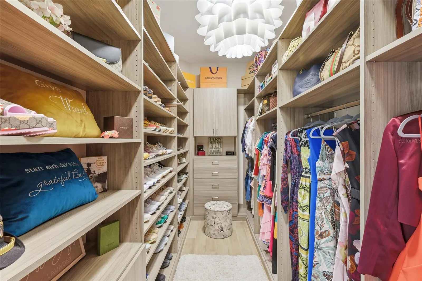 ceiling storage racks, a custom hall tree for jackets and sports gear, and an expansive layout that