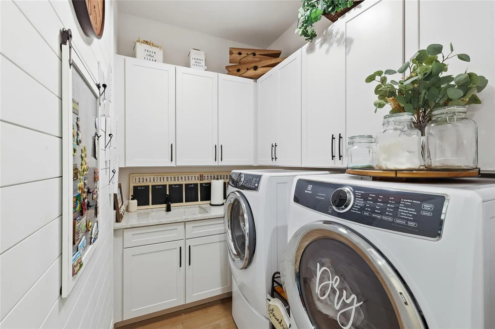 custom wood accent wall in the family room, shiplap and cabinetry in the laundry room, and a