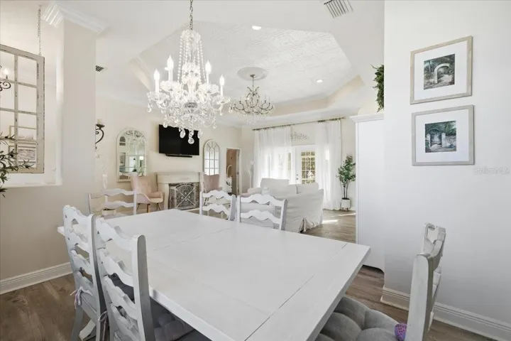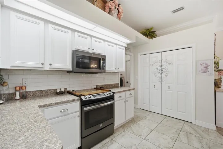 Beautifully maintained 3-bedroom, 2-bath single-family home offering a bright, open layout and tasteful finishes throughout. The inviting exterior features a well-kept lawn and attractive curb appeal. Inside, the kitchen showcases white cabinetry, granite countertops, tile flooring, stainless steel appliances, and subway tile backsplash, opening seamlessly to the dining and living areas—ideal for both everyday living and entertaining. The dining space is highlighted by large windows and elegant lighting, allowing for abundant natural light. The spacious primary suite includes a double-sink vanity and a walk-in tiled shower with decorative accents. Neutral finishes and crown molding add a cohesive, refined touch throughout the home. Enjoy Florida living on the covered rear patio, perfect for relaxing or outdoor seating. Conveniently located near shopping, dining, and major roadways in Spring Hill. Seller also owns a neighboring property, presenting a rare opportunity for buyers seeking proximity for family members or related households while maintaining separate residences.
