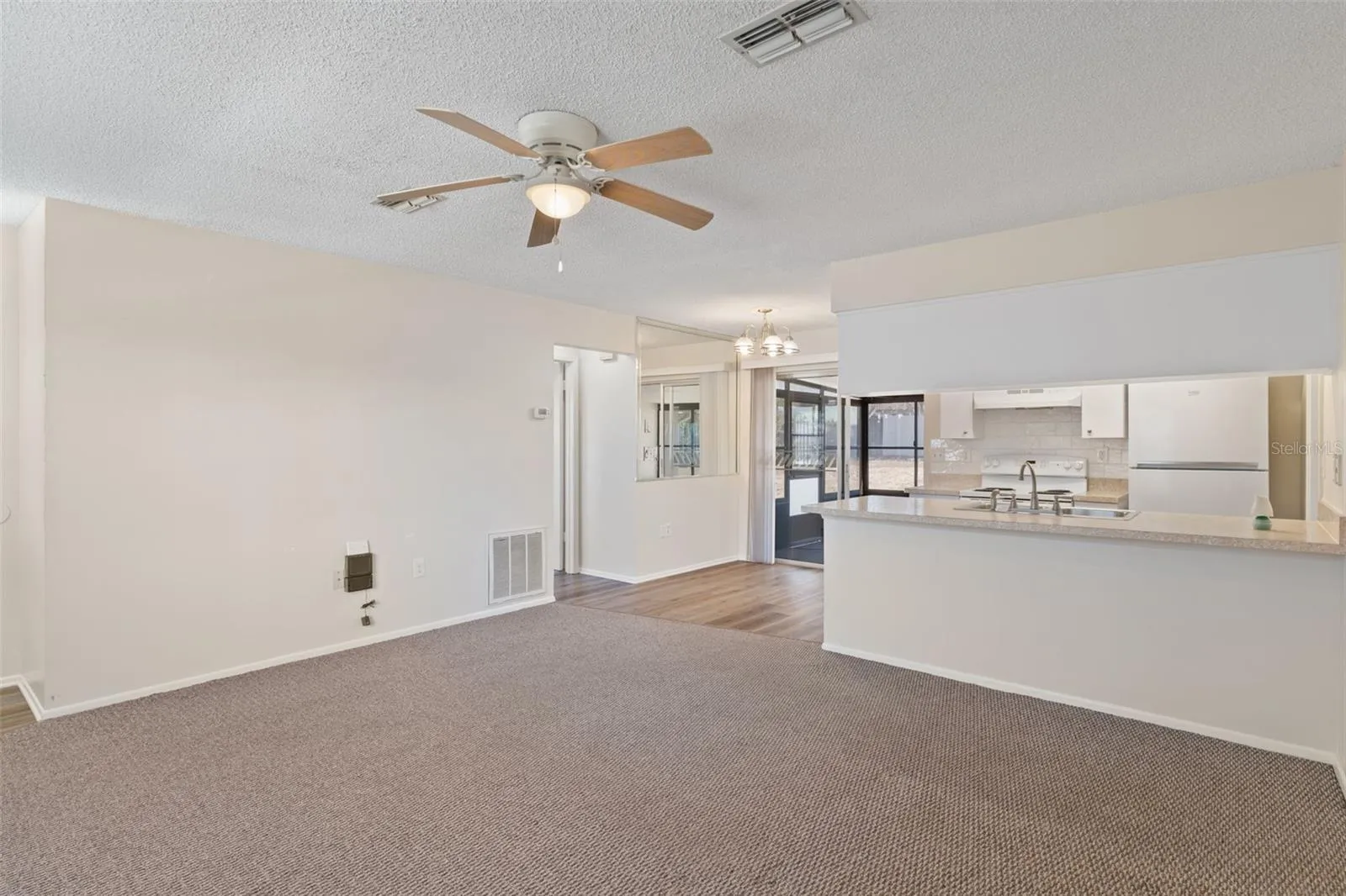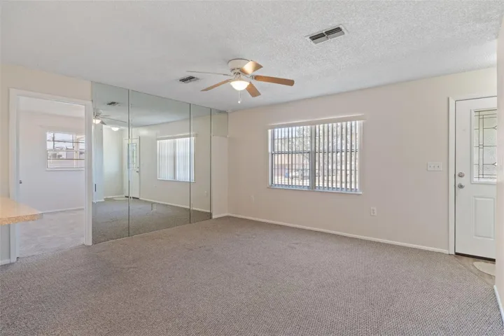 Welcome to this beautifully maintained 3-bedroom, 2-bath home offering comfort, flexibility, and pride of ownership—perfect for a first-time buyer, investment opportunity, or a low-maintenance retirement lifestyle. From the moment you arrive, you’ll appreciate the inviting curb appeal, fresh exterior mulch, and welcoming entry that set the tone for how well this home has been cared for. Inside, the spacious living room features soft carpeting, ceiling fans, window blinds, and a mirrored accent wall that enhances natural light. The kitchen and dining nook sit just off the living area, creating an easy and functional flow. All wet areas feature luxury vinyl plank flooring, while the updated kitchen offers soft-close cabinetry, subway-style backsplash, and an eat-in breakfast bar ideal for casual dining. The primary bedroom includes carpet flooring, dual closets—including a walk-in—and a nearby linen closet. The updated en-suite bathroom features a tub/shower combination and single vanity. Bedroom two offers ample closet space and carpeting, while bedroom three is privately located off the carport with its own access and direct connection to the enclosed rear lanai—ideal for guests, a home office, or flexible living arrangements. Bedrooms two and three share a guest bathroom with a large tiled shower and updated single vanity. Outdoor living is a highlight with a huge, spacious backyard, a 26×15 single carport, a 16×10 open rear patio, and a 16×12 vinyl- and screen-enclosed rear lanai overlooking the yard—perfect for relaxing or entertaining. Major updates include a new roof (2022), HVAC (2015), new ductwork (2024), water heater (2019), and septic pumped November 2024, offering peace of mind for years to come. This home is exceptionally clean, move-in ready, and thoughtfully updated—truly a home that fits every stage of life. Homes this clean, updated, and versatile don’t come along often—schedule your private showing today and see the value for yourself.