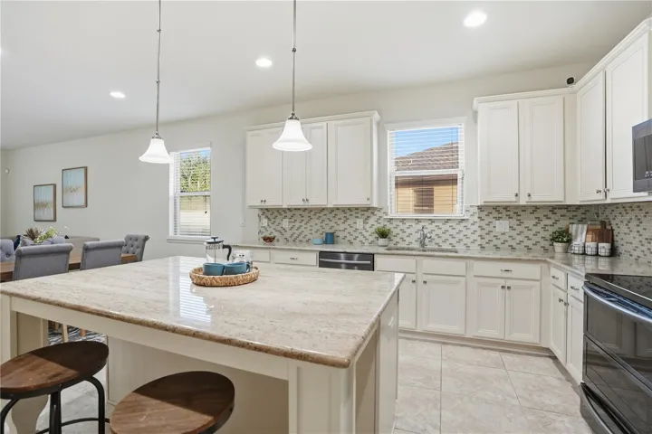The heart of the home is a chef-inspired kitchen featuring rich granite countertops, a stylish tile backsplash, and an extended island with bar seating—ideal for casual dining and hosting. Black stainless steel appliances add a sleek, modern touch while complementing the kitchen’s upscale design.