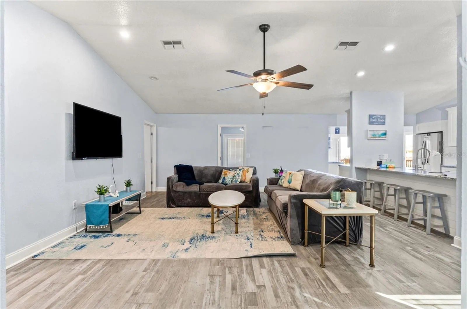Out back, a SCREEN-ENCLOSED LANAI JUST OFF THE DINING AREA offers a shaded, comfortable place to relax. A MASSIVE BRICK PAVER DECK spans the rear of the property, making this setup ideal for entertaining and pets. Enjoy SUNSET VIEWS FROM THE WEST-FACING FRONT DECK and SUNRISE VIEWS FROM THE REAR PATIO. ALL PRIMARY LIVING AREAS ARE LOCATED UPSTAIRS, including the kitchen, dining area, bedrooms, and bathrooms. The upper level features LVP FLOORING THROUGHOUT, a REMODELED KITCHEN WITH GRANITE COUNTERTOPS, A FARM-STYLE SINK, AND A SEPARATE BAR AREA. The home offers 3 BEDROOMS + 3 FULL BATHROOMS, all upstairs, with TWO EAST-FACING BEDROOMS that capture beautiful morning light. ALL BATHROOMS HAVE BEEN REMODELED, and the laundry room is also located upstairs for everyday convenience.