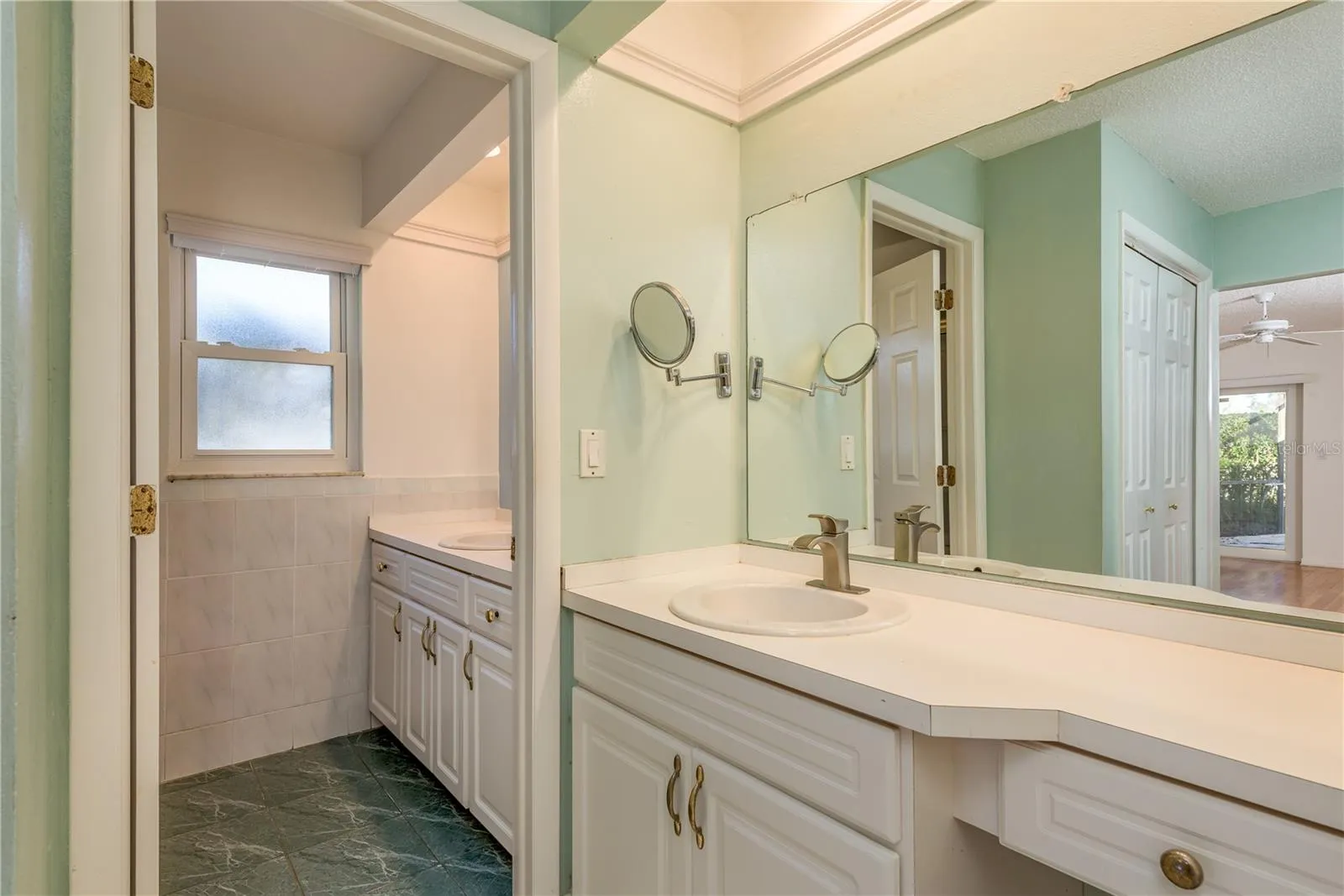 The primary suite includes a private ensuite bath with vanity area, a large walk-in closet, and direct access to the pool through private sliders. Bedrooms 1 and 2 are generously sized and share a Jack-and-Jill bathroom, while Bedroom 3 features an updated bath and private pool/deck access, making it ideal for guests or multigenerational living.