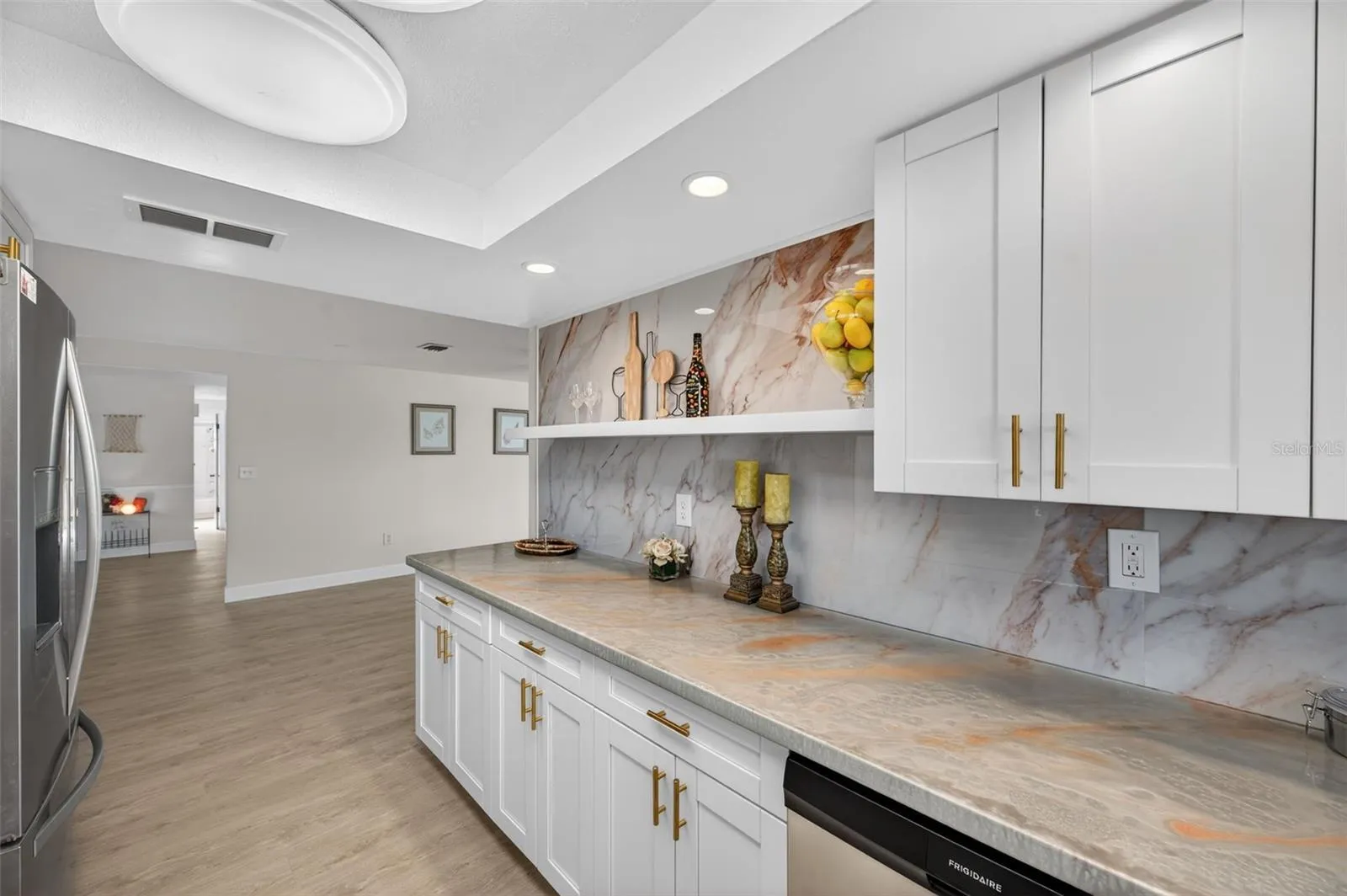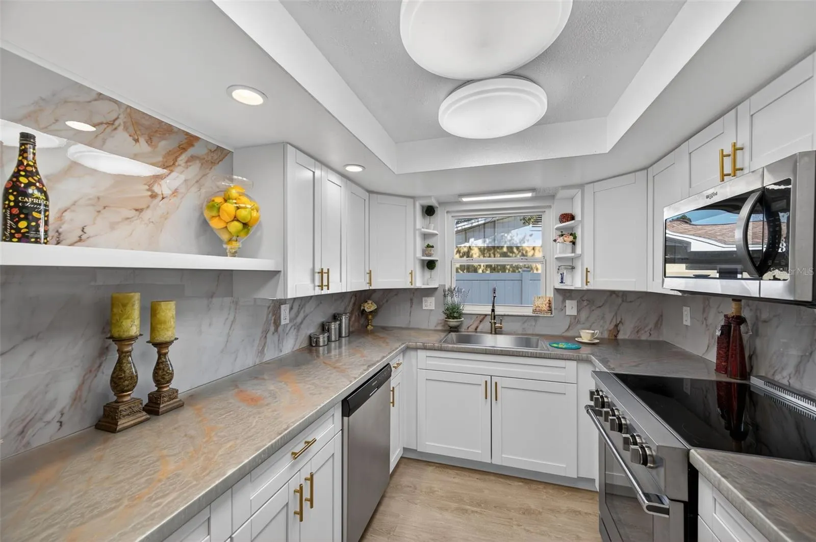 WELCOME TO YOUR WATERFRONT PARADISE at 5425 Drinkard Dr, New Port Richey, FL. This FABULOUS 1-STORY CANAL-FRONT HOME on a BIG corner lot with 9,624 sqft features 3 bedrooms, 2 bathrooms & 2-car garage with 1,715 sqft of living space, offering the ULTIMATE FLORIDA SALT LIFE LIFESTYLE. From the moment you arrive, you’ll notice the EXPANSIVE DRIVEWAY providing ample parking for guests, boats & toys. Step inside and be greeted by a BRIGHT & AIRY OPEN-CONCEPT FLOOR PLAN filled with NATURAL LIGHT streaming through the DOUBLE-PANE, THERMAL-TINTED, LOW-E WINDOWS illuminating the interior together with the multiple light fixtures. LUXURY VINYL FLOORING [12mm thickness & “Sand Beach” color] elegantly flows throughout the entire home. The OPEN FLOOR PLAN consists of the kitchen, living, dining & family rooms. The HUGE living room features chair molding which flows into the dining room which also features a built-in cabinet & double glass sliding doors to the screened lanai. Generous in size is the family featuring a ceiling fan & another set of glass sliding doors to the lanai. The BEAUTIFUL kitchen consists of NEW cabinetry with MODERN GOLD handles, recessed lights, deep farmhouse sink with gooseneck faucet, tray ceiling, artistic custom finish on the counters, complimentary marble-look backsplash, floating shelves & stainless steel appliances including a French door fridge, dishwasher, disposal, microwave & convection oven/range. Retreat to your PRIVATE PRIMARY SUITE which can accommodate king-size furniture. The primary bathroom features shaker-style gray cabinets, MODERN rectangular sink, cultured marble counter, tray ceiling, medicine cabinet & step-in shower with hexagonal tile floor & large ceramic subway tiles. The second bedroom can also accommodate king-size furniture & has dual closets. In this split plan, the third bedroom is located off the family room & has waterfront views. The full bathroom consists of dual sinks, tray ceiling, shaker-style cabinets & tiled tub/shower combo. In the oversized garage, you’ll find the NEWER water heater, laundry hookups, utility sink, Generac power system for the generator, side door exit & hurricane-rated garage door. BONUS: All the house systems have been updated too! Step outside to your BACKYARD OASIS where TRUE INDOOR-OUTDOOR LIVING comes to life! The COVERED portion of the screened lanai is MASSIVE with dimensions 40′ x 12′. The screened lanai extends out for an additional patio space of approximately 23′ x 20′ with a firepit as its center. There are convenient 3 screen door exits into the FULLY FENCED YARD. Launch your kayak or paddleboard from your backyard or hop on your boat for a day of fishing. Your MARVELOUS house will faces East so you can enjoy the setting sun painting the sky in VIBRANT COLORS every evening. Hop on your GOLF CART & CRUISE to downtown New Port Richey featuring FANTASTIC restaurants, taverns, festivals, shopping & professional offices. Sims Park is PHENOMENAL for everyone with a playground, splash pad, walking paths along the river & an outdoor amphitheater. The public boat launch is just a few short minutes away where you can take your boat directly to the Gulf of Mexico or enjoy kayaking down the river. Robert K. Rees Beach Park is about 3.8 miles away! The City of New Port Richey is BUSTLING & THRIVING! Location is IDEAL near schools, beaches, medical plazas, shopping centers, restaurants, places of worship, airport & tourist attractions. MAKE THIS YOUR FUTURE HOME!