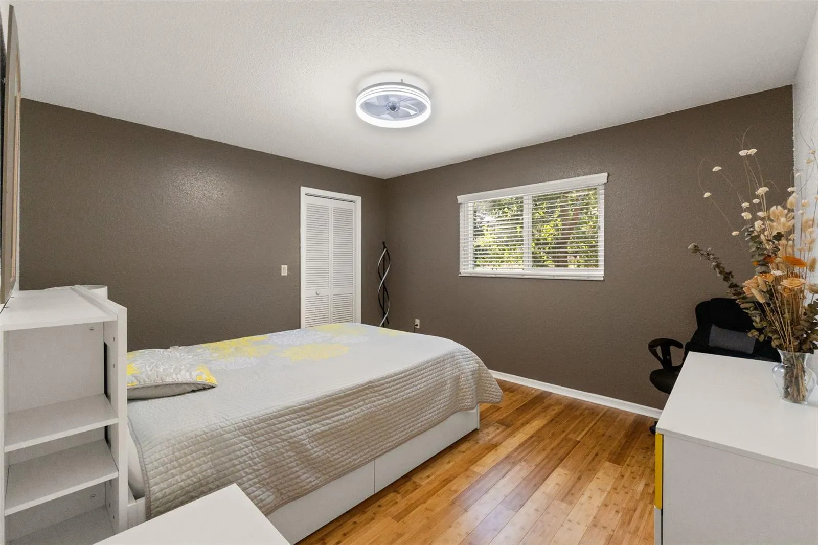 The kitchen offers abundant cabinetry, all appliances included, and a charming bay-window breakfast nook overlooking the backyard. A separate laundry room comes complete with washer and dryer. The split-bedroom floor plan provides privacy, with the primary suite tucked away on its own side of the home, featuring a private powder room and full bath. Bedrooms two and three showcase new bamboo flooring and share a guest bath with direct pool access.