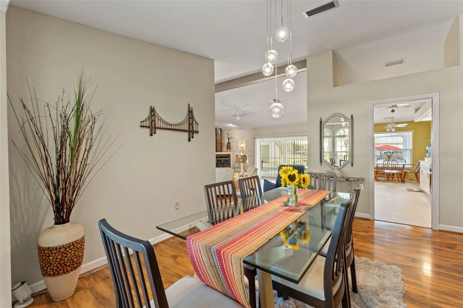 Step inside through new double entry doors with built-in blinds into a spacious living room featuring vaulted ceilings and a cozy wood-burning fireplace. Warm wood-tone flooring flows through the main living areas, complemented by a formal dining space ideal for entertaining. Triple pocket sliding glass doors open completely to the pool area, seamlessly blending indoor and outdoor living and opening up the entire back of the home.