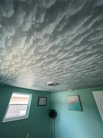 The spacious primary bedroom offers a serene retreat with a dreamy cloud wallpapered ceiling and plenty of room for a king-size bed. New windows throughout the home help keep utility costs low, while added attic insulation ensures comfort during the summer months.