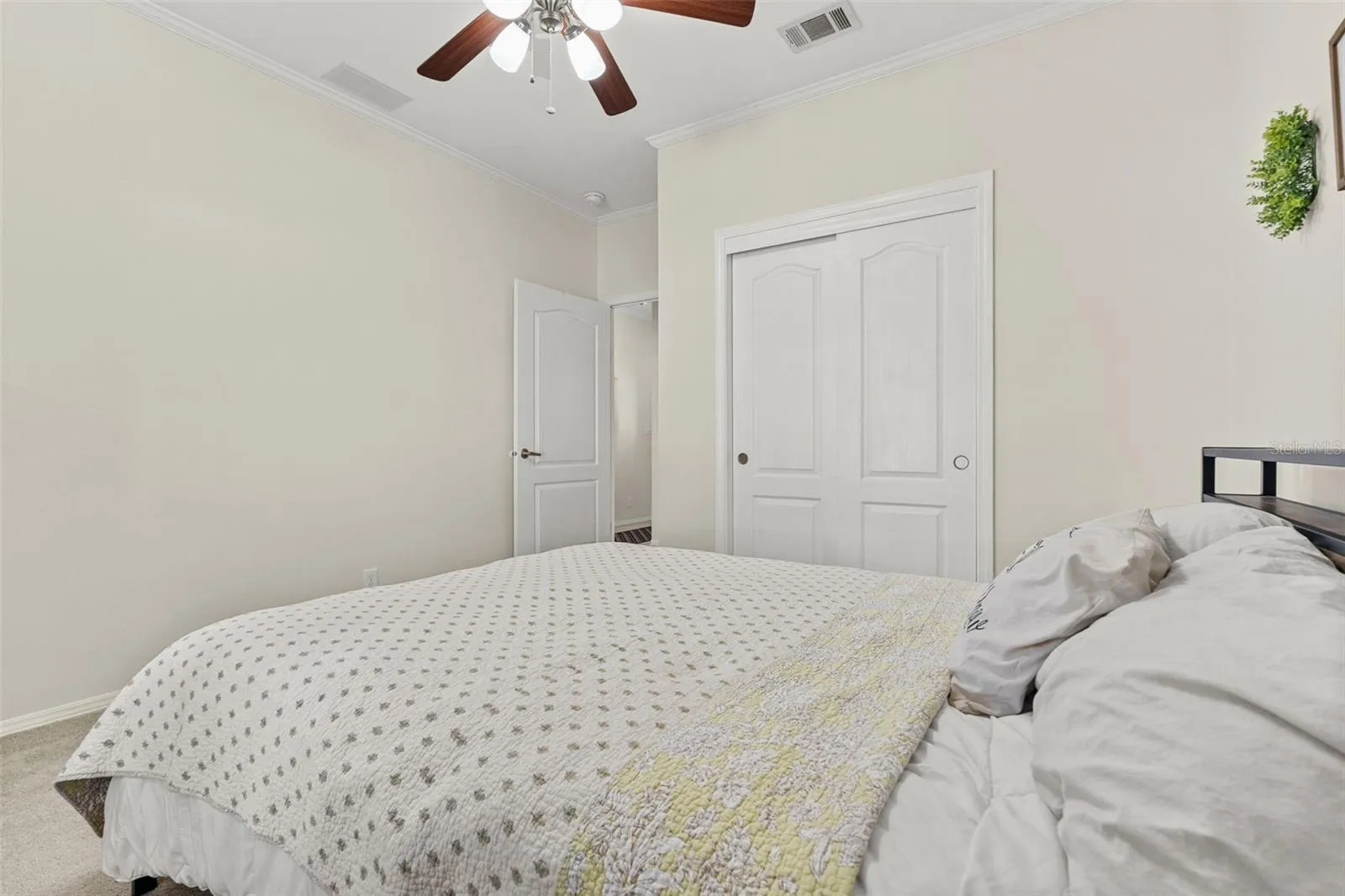 The primary suite is exceptionally spacious, offering a peaceful retreat with a large walk-in closet featuring built-in storage and a private ensuite bath complete with a double vanity and a walk-in tiled shower with bench seating. A secondary bedroom with built-in cabinetry functions beautifully as a guest room, home office, or hobby space. Storage is plentiful throughout the home, including a full laundry room with utility sink and cabinetry.