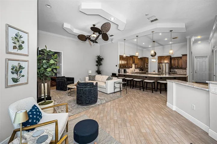 Impressive curb appeal begins with dual brick paver driveways, a grand double-door entry, and an elegant tile roof. Inside, you’ll find tile flooring throughout the main living areas, crown molding, tray ceilings, decorative niches, and a fireplace in the formal living room. A separate dining room, spacious family room filled with natural light, and a dedicated office create an ideal layout for both everyday living and entertaining.