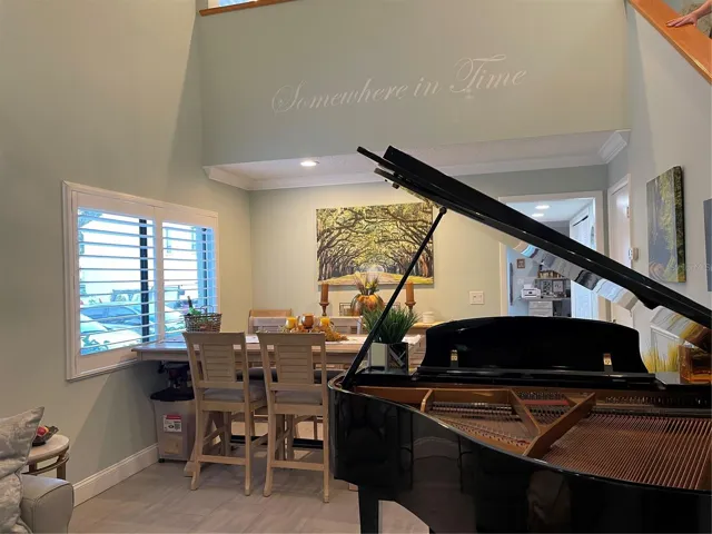 PRICED BELOW APPRAISAL FOR QUICK SALE. Large luxury one bedroom condo situated in a relaxing park like setting faces conservation area at this world renown nudist community. The Owner spared no expense when remodeling this condo to include rearranging the design of the first floor so the downstairs could include both a living room and an informal flex room near the kitchen. The flex room/family room has dual built-in desks and drawer systems and a 60-inch Samsung Smart TV. The modernized kitchen has new custom self-closing cabinets, custom Corian quartz counter tops, recessed lighting and pendant lights. Appliances include a Whirlpool washer and dryer in the kitchen closet, 20.6 cubic ft refrigerator, range and microwave. Countertop switch near sink operates the insinkerator disposal. Sliding glass doors leading into the family room makes it convenient when bringing in groceries from the parking lot. Because this condo is a corner unit extra windows provide more lighting in this condo. Quality plantation shutters are at all windows. A deluxe front storm door also brings the beauty of nature into focus. A soaring ceiling in the living room featuring crown molding and two levels of windows with plantation shutters is just awestriking. The large modern style bedroom loft upstairs overlooks the living room and conservation view. Most of the home features crown molding. A half bath under the stair well has Corian quartz countertop and vanity and Kohler stool. Bedroom upstairs has dual closets, a walk-in closet, a window seat that overlooks the community and a private ensuite. The bathroom upstairs features a remodeled shower with wall-to-wall ceramic tiles and a glass shower door. Corian quartz vanity in primary bathroom, plus a Kohler stool. Access to the attic is upstairs with a pull-down stair system. Ceiling fans were replaced with a Hampton Bay Ceiling fan with lights in flex room, Hunter ceiling fan with light kit in bedroom and Premium Dream Air ceiling fan in living room. In August of 2025 a 3 TON Rheem AC system with heat pump was installed with a Ecobee WIFI thermostat. The AC system comes with a 10-year transferable warranty. Amenities abound for those who wish to pay for a membership to use the neighboring nudist resort. Paradise Lakes Resort is adjacent to this nudist subdivision; but they are all within the compound behind the gates of Paradise. Club membership enables the residents to have use of the heated pools, hot tubs, water volleyball pools, pickleball courts, sand volleyball, nightclub, restaurant, Key West Bar, karaoke, poolside events, pool tournaments and other fun activities. This is clothing optional living at its finest. A truly natural nudist neighborhood popular through the decades in Pasco County. Community is conveniently located near shopping, golf courses, medical facilities, restaurants, and just about 45 minutes to the Gulf and about thirty minutes to Tampa International Airport.
