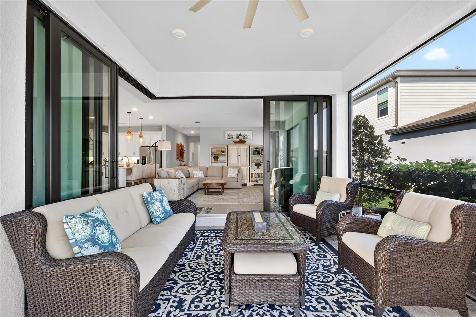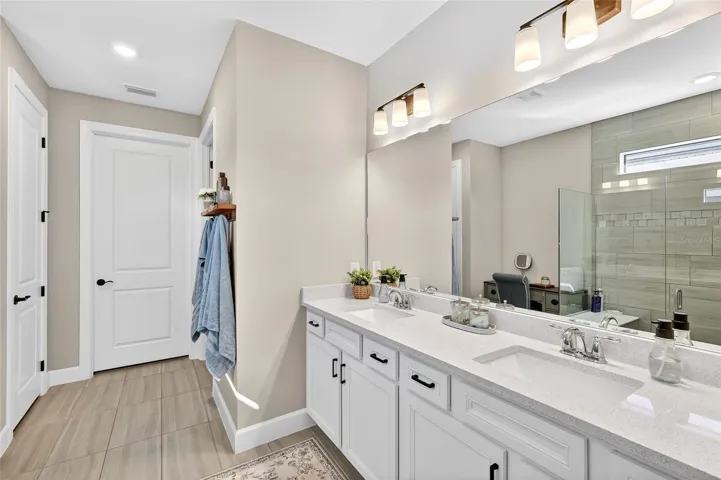 Welcome to this stunning, better-than-new 3-bedroom plus den, 2 bath pool home in the gated community of Magnolia Ranch. Featuring smart home technology, no CDD fees, and low HOA fees, this residence combines modern convenience with exceptional value. Set on a picturesque pond lot with a modern flat tile roof, pavered driveway, and inviting front porch, this home opens to a bright entryway and an airy, open triple-split floorplan designed for both comfort and functionality. Off the hallway, a spacious flex room with double doors offers plenty of privacy and is the perfect space to use as an office, home gym, den, or even a 4th bedroom. Just beyond the flex room is your open concept kitchen and eat-in cafe that overlooks the large Gathering Room. A zero-corner sliding glass door serves as the focal point of the Gathering Room and cafe, creating a seamless transition between indoor & outdoor living. Your beautifully appointed gourmet kitchen is thoughtfully designed with 42″ cabinetry topped with crown molding, under-cabinet lighting, quartz countertops, a cooktop with matching hood, soft-close drawers, a deep single-bowl Blanco porcelain sink, timeless herringbone subway tile backsplash, & a dedicated pantry. You will LOVE the top-of-the-line KitchenAid Professional Series stainless appliances, including the double wall oven, making cooking a pleasure in this modern culinary space. Adjacent to the kitchen, the spacious kitchen cafe effortlessly accommodates both everyday dining and upscale gatherings. Step into a lanai designed as a private resort-style sanctuary. At its center is a heated, screened-in smart saltwater pool, upgraded with a NEW salt cell (2025) and a tranquil waterfall, overlooking serene pond views. Best of all, the entire experience is controlled right from your phone via the iAqualink app, allowing for effortless management of your outdoor oasis. Surrounded by tropical palms and privacy hedges, this lush sanctuary is perfect for entertaining or relaxing in the Florida sun. Back inside, the Primary Retreat is a serene, sunlit space with views of the lanai. Its expansive en-suite bath features a floor-to-ceiling tiled walk-in shower, an extended quartz vanity with dual sinks, a private water closet, & a massive walk-in closet. Toward the front of the home, two generous guest bedrooms flank the foyer, sharing a well-appointed full hallway bath. Nearby, the functional laundry room comes complete with a Whirlpool top-loading washer and matching dryer. Additional notable upgrades include Security sensors on all windows & doors; Wi-Fi extender; MyQ garage door opener; Smart Resideo enabled thermostat; Keyless front door lock; 8 foot interior doors; Plantation shutters throughout; Whole home gutters; No-See-Um 20/20 mesh screen pool enclosure; Ceiling fans in all bedrooms & lanai; Premium carpet pad in bedrooms; Hurricane shutters; 5 1/4″ baseboards throughout; Garage w/4 foot extension; Epoxy garage floors; & Overhead storage racks in garage. Situated in highly desirable Magnolia Ranch, this quaint master planned gated community is maintenance assisted – so put those lawnmowers and weed whackers away, because this neighborhood includes landscape maintenance for the front, back, and side yards…perfect for those looking for the laid back Florida lifestyle! Just minutes from world-class shopping, dining, entertainment, and Gulf Coast beaches, this home offers the perfect combination of luxury, convenience, and coastal living.