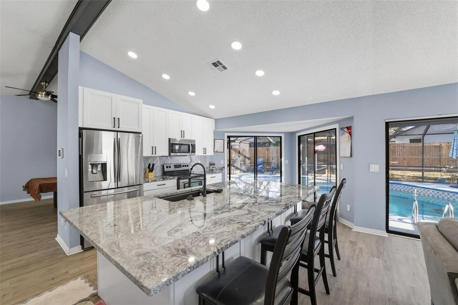 Tucked onto a generous 0.33-acre lot, this inviting 3-bedroom, 2-bath home with a 2-car garage offers a comfortable, easygoing lifestyle from the moment you arrive, featuring a gently sloped driveway, a 2023 garage door with windows, and a neatly maintained lawn supported by a 12-zone Rain Bird irrigation system serviced in 2025. Inside, the foyer welcomes you with new flooring installed in 2022 and a defined tiled entry, while frosted glass panels and ceiling height create an open, airy introduction that flows naturally into the main living spaces. The family room opens wide with wood-style laminate flooring and vaulted ceilings, where large windows and sliding doors bring in natural light and views of the rear porch and pool, maintaining clear sightlines to the kitchen and living area. The dining area sits comfortably between the kitchen and living room, reinforcing the home’s open layout. The kitchen was remodeled in 2023 and features stainless steel appliances, granite countertops, soft-close cabinetry and drawers, recessed lighting, and sliding glass doors that connect visually to the outdoor living space. The living room continues the open-concept design with vaulted ceilings and floor-to-ceiling windows that frame backyard views. Privately positioned, the primary bedroom offers new carpeting from 2022, a walk-in closet, and a spacious en-suite bathroom, while major updates include a roof replaced in 2022, a hot water heater replaced in 2022, and an original HVAC system with key components replaced in 2023. Bedroom two offers a comfortable, flexible space with carpeting and a window, ideal for guests, a home office, or everyday living, while remaining quietly positioned near the main areas. The second bathroom combines a dual-sink vanity with laminate flooring and a tiled tub-and-shower area, brightened by a window that keeps the space feeling fresh. Bedroom three adds charm with its arched window, carpeted floors, and generous closet, while the nearby laundry room adds convenience just off the foyer. Outdoors, a covered and screened lanai rescreened in 2024 overlooks a sparkling screened pool and is plumbed for an outdoor kitchen, complemented by a separate storage shed that provides convenient space for tools, equipment, or seasonal items, while a new fence installed in 2025 adds privacy, creating a seamless indoor-outdoor setting designed for year-round enjoyment, all conveniently located near parks, nature preserves, waterways, golf courses, shopping, and dining.