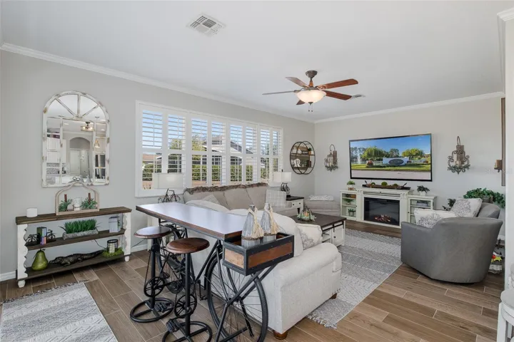 This home has been completely updated from head to toe (over 100k of upgrades in the past 2 years), featuring ALL NEW WOOD-LIKE TILE FLOORING flowing seamlessly through the living areas. The formal living and dining rooms are enhanced by rich crown molding and tranquil views of the pond and expansive oversized screened lanai, perfect for indoor-outdoor living.