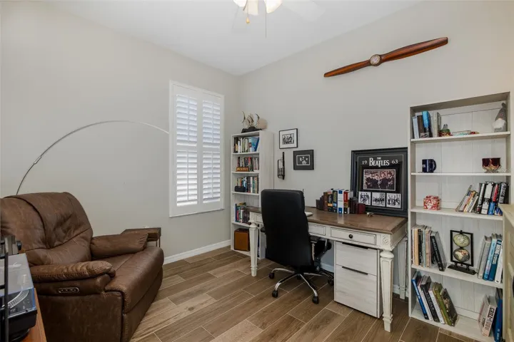 The spacious owner’s suite is a true retreat, filled with natural light from multiple windows and featuring an atrium door leading to the lanai. Dual walk-in closets and a beautifully upgraded en suite bath complete the space, offering white cabinetry, gleaming counters, a relaxing soaking tub, and a separate walk-in shower.