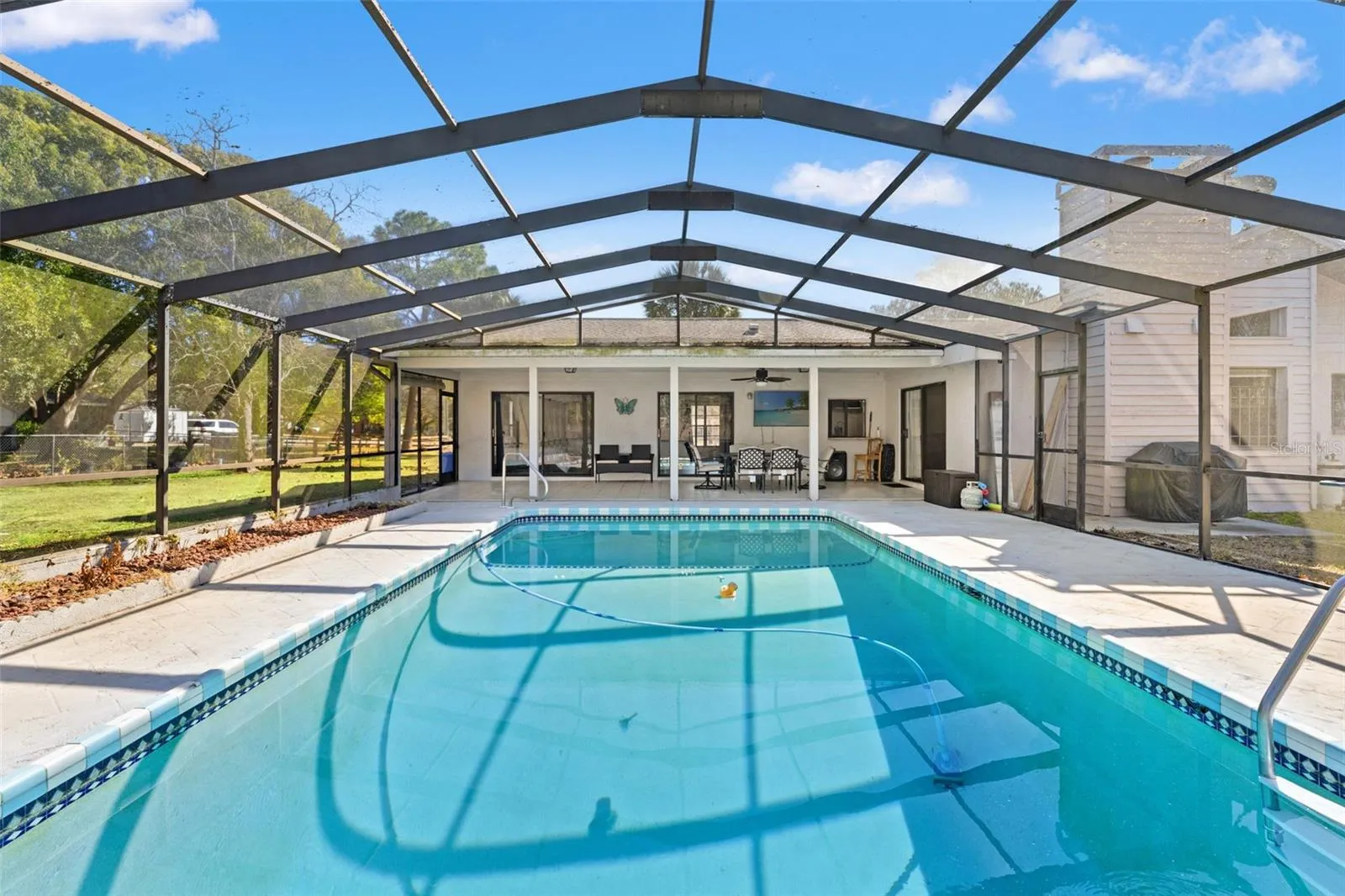 Step outside to your screened pool enclosure and expansive cool deck, ideal for relaxing or entertaining year round. The fully usable 1.03 acre lot includes mature trees, wide open green space, and a large chicken coop already in place. Zoned Agricultural-Residential, you can have chickens and roosters, giving you the freedom to create your own backyard homestead.