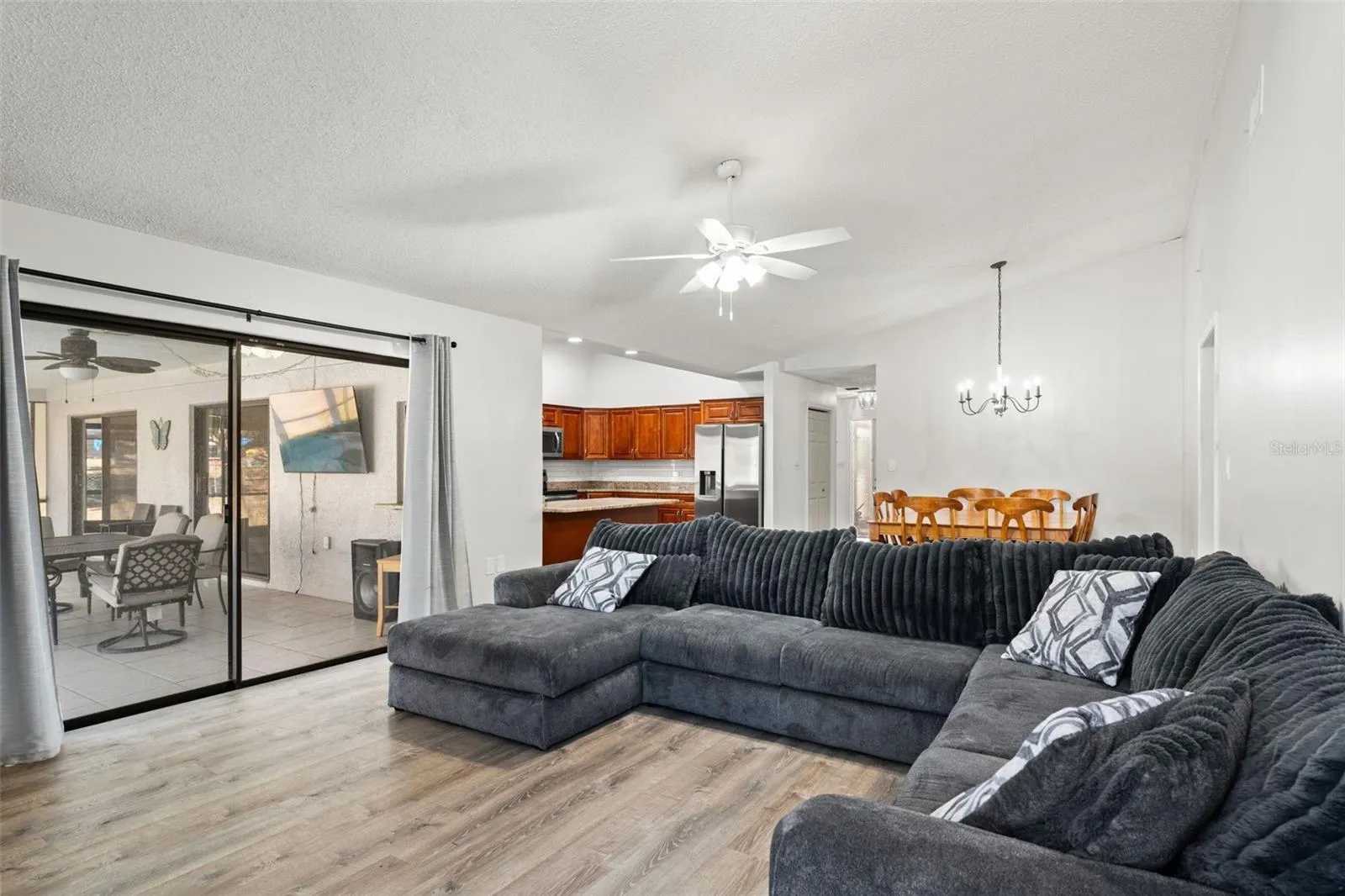 Inside, you will find a generous living room with a wood burning fireplace and sliding glass doors that lead to the screened pool and oversized covered porch. The kitchen features granite countertops, rich wood cabinetry, stainless steel appliances, and a breakfast nook that flows into the family and dining areas, creating an open and comfortable layout.
