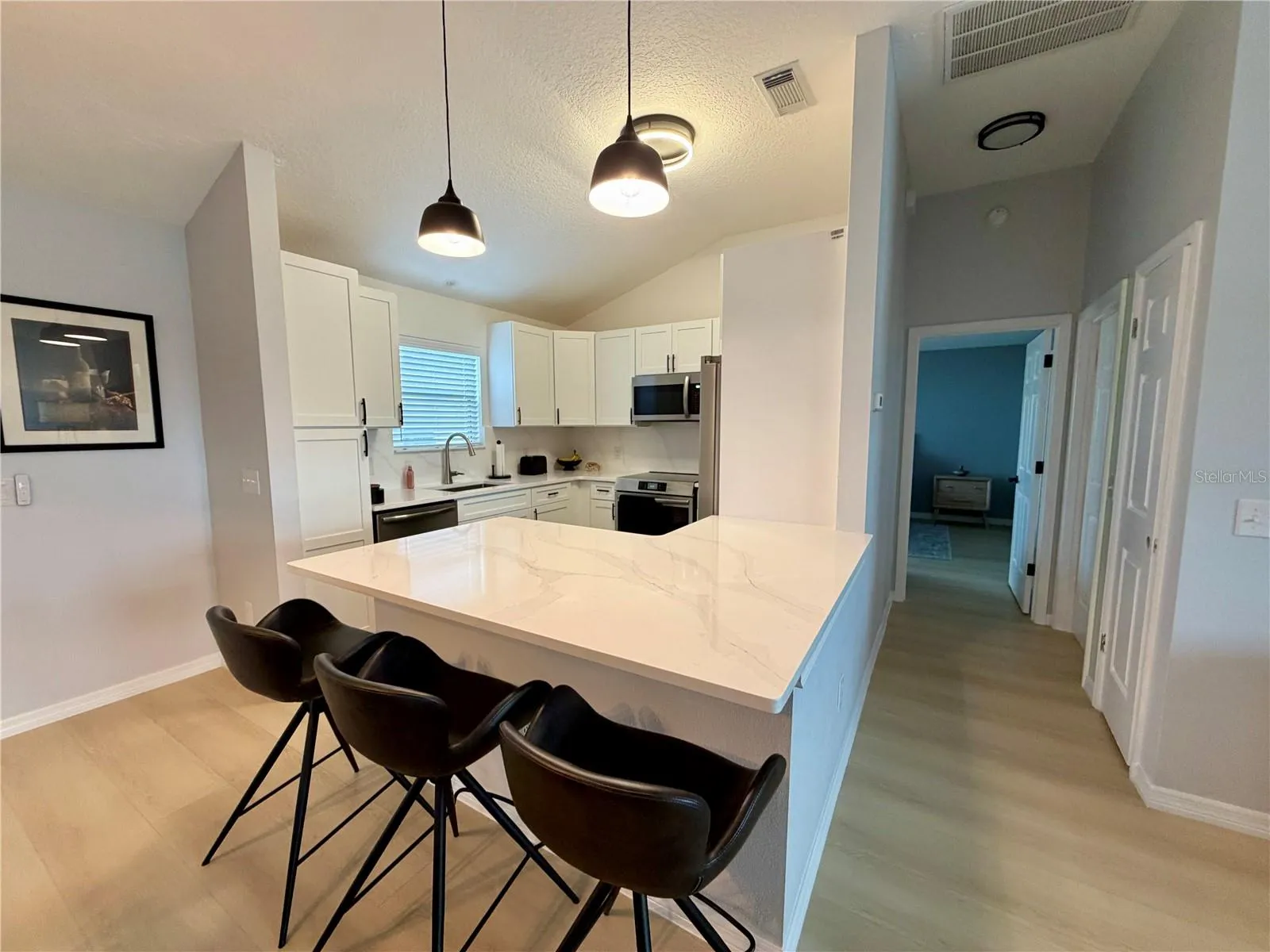 The heart of this home is undoubtedly the brand-new gourmet kitchen. Featuring sleek, soft-close cabinetry, sparkling quartz countertop and backsplash, and a full suite of brand-new stainless-steel appliances. A breakfast bar provides additional seating and prep space, perfect for casual dining or entertaining.