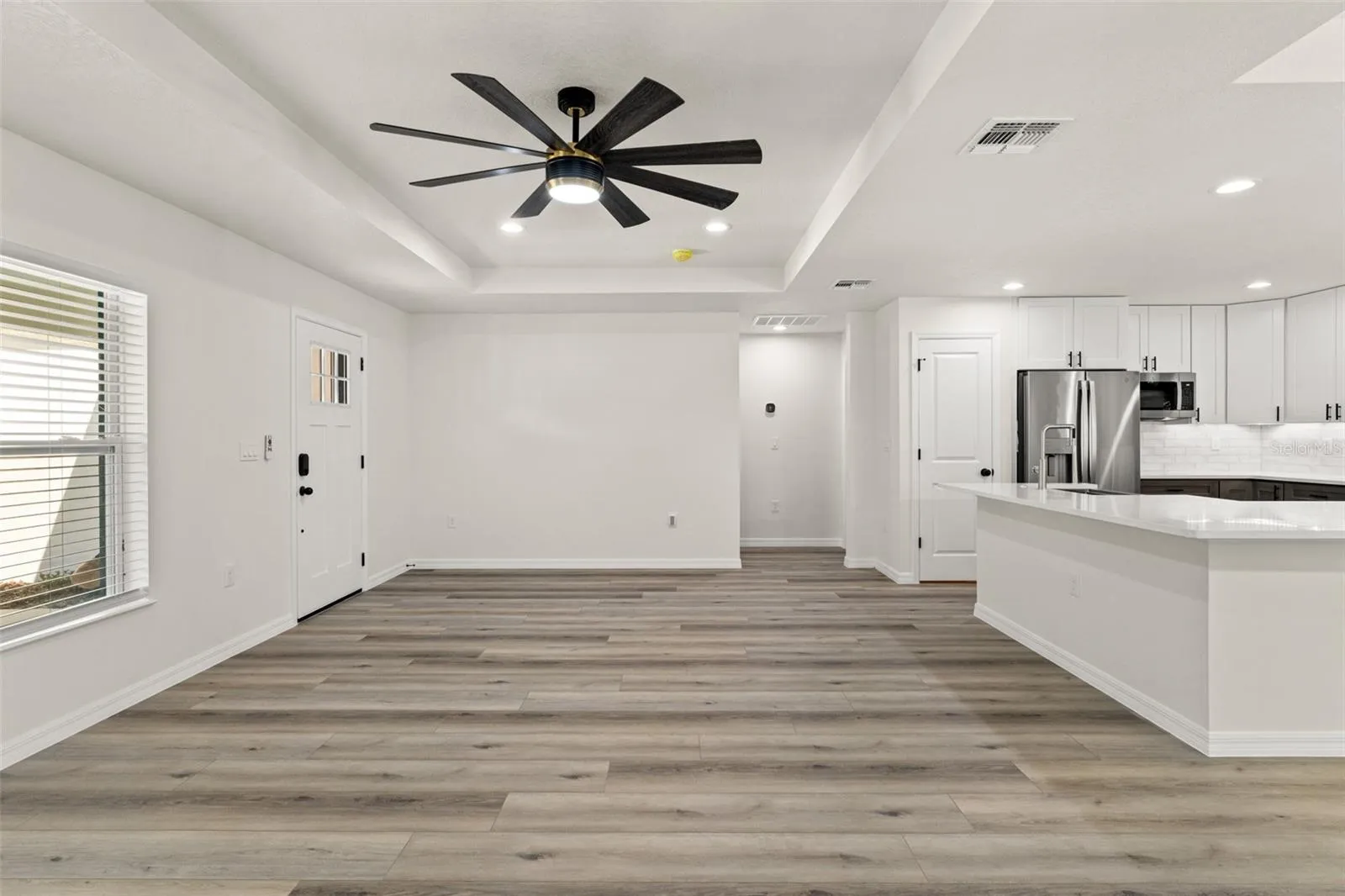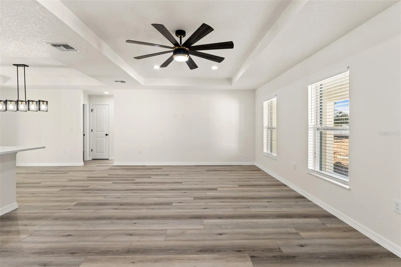 Inside, you’ll find tray ceilings, luxury vinyl plank flooring with no transitions, veigned quartz countertops, soft-close cabinetry, and stainless steel appliances. The kitchen is open and luxurious, perfect for everyday living or hosting friends and family. The primary suite features a spa-style bathroom with a soaking tub, walk-in shower, heated towel rack, LED exhaust, and a huge custom walk-in closet with built-in shelving. The indoor laundry room includes matching cabinetry and quartz, the garage has epoxy floors, and window treatments are already installed.