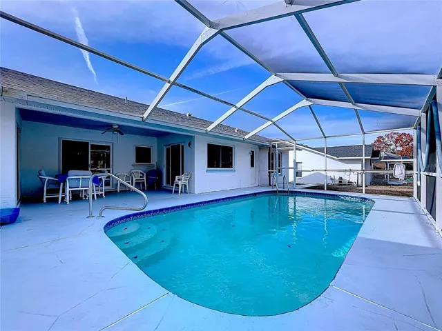 Experience Florida living in this impeccably maintained three-bedroom, two-bath, heated pool home with a spacious two-car garage, perfectly positioned with no rear neighbors and serene views of the Sand Hill Scout Reservation.