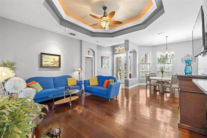Lake Jovita is one of Pasco County’s premier neighborhoods, lying among rolling hills and scenic vistas. And within this picturesque community, 13235 Legends Trail embodies affordable luxury living. Manicured landscaping and grand columns greet you with instant curb appeal, while welcoming you inside. When you step in you are instantly put at ease in the warm atmosphere created by the natural light streaming through the large dining window and sliding glass doors, gleaming engineered hardwood floors, tray ceiling with accent lighting, pool view, and open layout. While the area is known for its friendly neighbors, the almost-half-acre lot provides some space and privacy as well as a pleasant view from your living and outdoor areas. The spacious 4 bedroom 3 full bath layout of the house enables options for families, multi-generational living, work from home, and more. When it’s time to unwind, open the doors to your sparkling pool and screened lanai to enjoy a beverage, some family time, or a few laps to revive you. The home has been impeccably maintained with newer roof, a/c, refrigerator, pool pump, garage door opener and more. Please see the list included with the photos for a complete listing. Lake Jovita is not only beautiful, but also vibrant, with walking trails, pickleball courts, and playground. Additionally, top-ranked golf, tennis, a Jr. Olympic size pool, fine dining and more are available with optional club membership. Grocery, restaurants, Mirada Lagoon, medical facilities, St. Leo University, PHSC, Tampa Airport, and Orlando are all within easy commuting. We invite you to tour the house and imagine the lifestyle that could be yours.