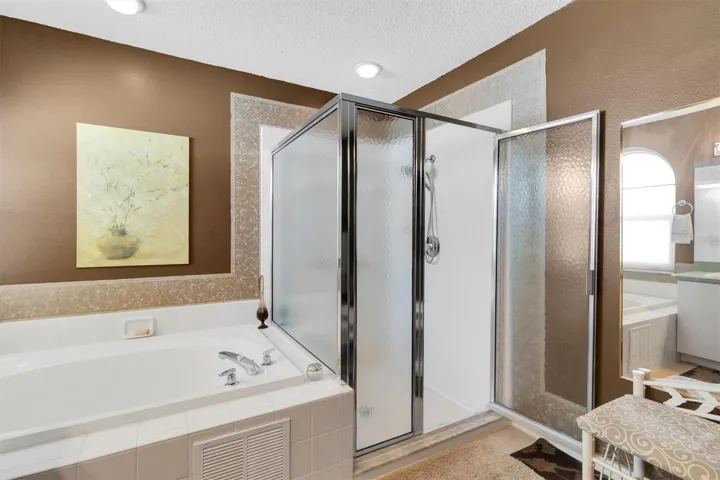 Outdoor living is just as impressive. Enjoy your extended screened lanai with an aluminum roof, stamped concrete flooring, and pre-installed patio electrical ready for a hot tub hookup. The brick paver driveway has been recently sealed, the garage floor features a clean epoxy finish, and the garage includes a MyQ smart door opener and retractable garage door screen.