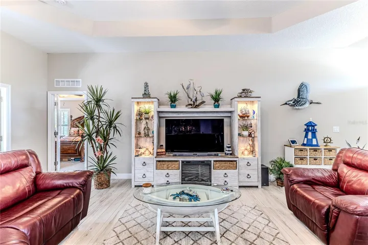The split plan, great room style home has an octagonal tray ceiling & French Doors that lead to the enclosed lanai that is appx. 300 sq. ft. with custom windows/sliders/screens for those cozy winter Florida evenings and screens for the summer days. Lanai opens to Beautiful Paver Open Patio for dining and relaxing.