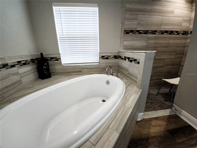 closets and an ensuite master bath that has a separate walk in shower with dual shower heads, soaking tub, and private toilet. The brightly