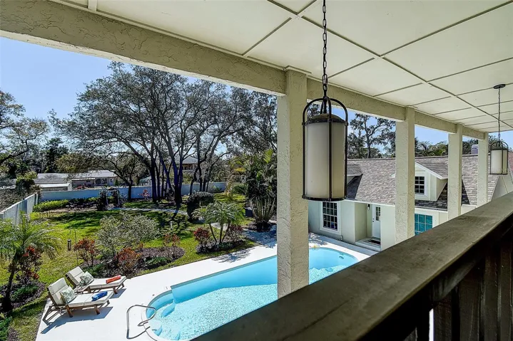 Upstairs, the primary suite serves as a private retreat, complete with a recently remodeled bath (2025) and access to a full-width balcony overlooking the illuminated pool and backyard — a peaceful setting that enhances the home’s connection to its outdoor surroundings.